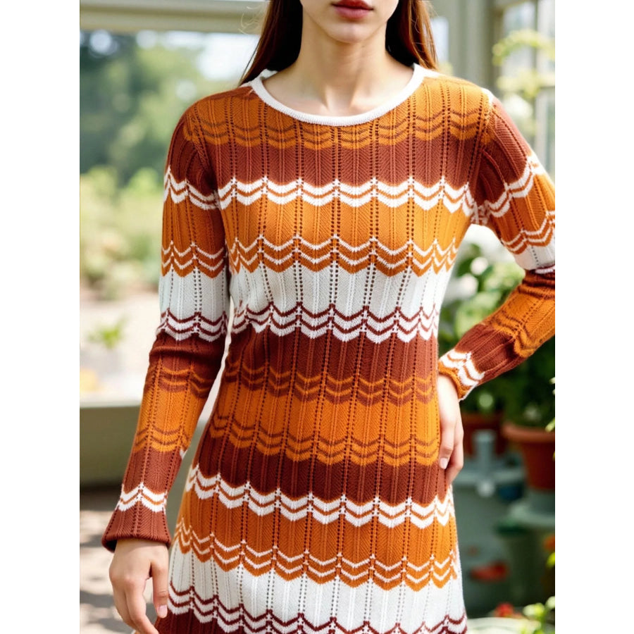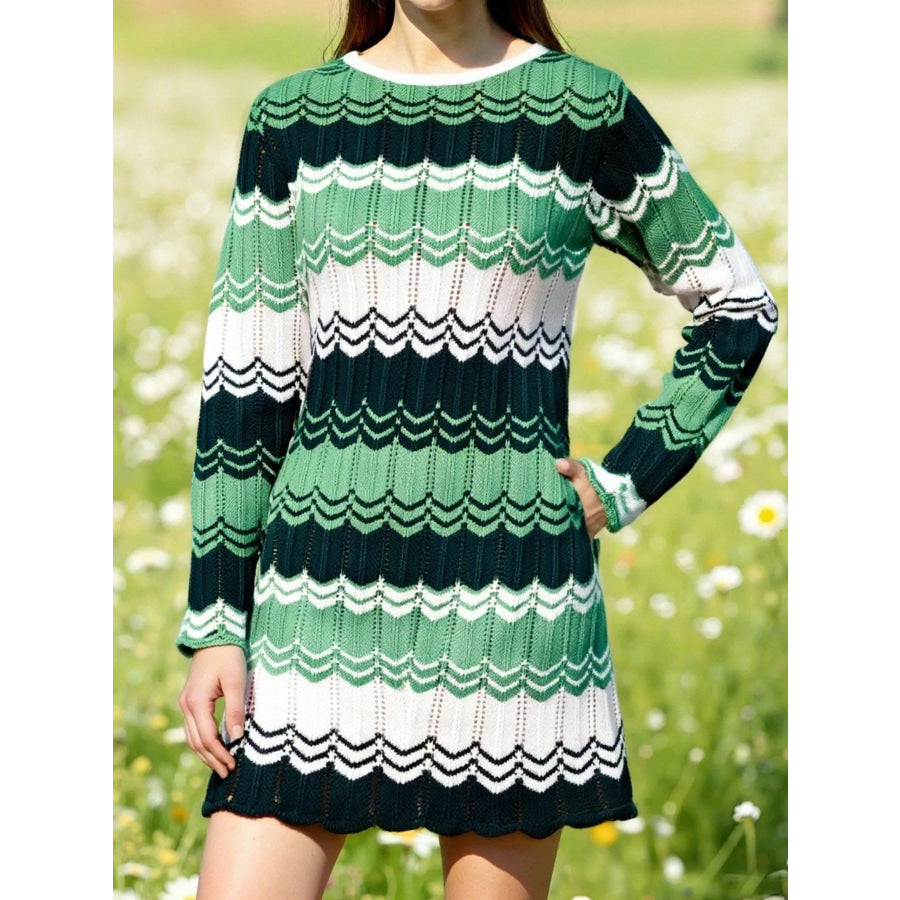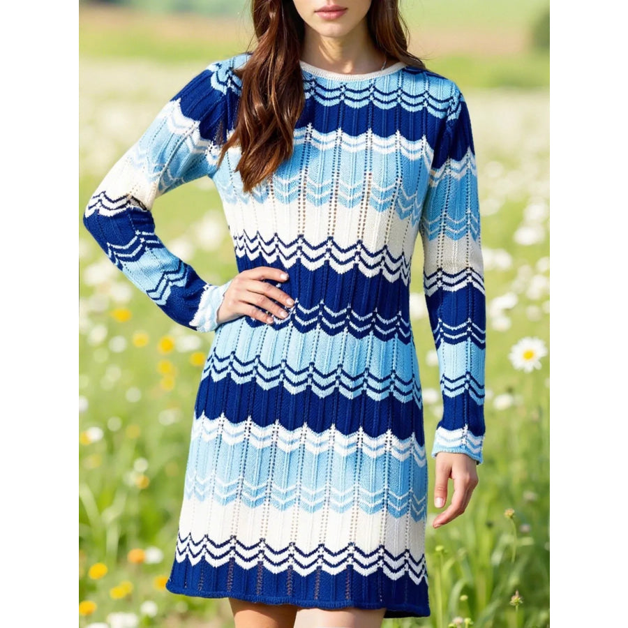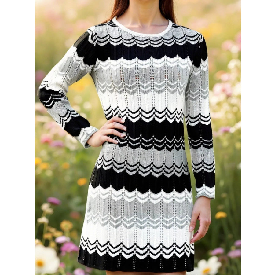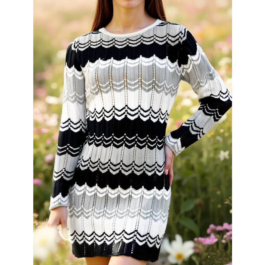 Openwork Wave Pattern Long Sleeve Sweater Dress