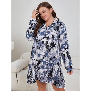 Plus Size Floral Lapel Collar Long Sleeve Night Dress