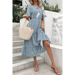 Printed Tassel Tie Flounce Sleeve Dress