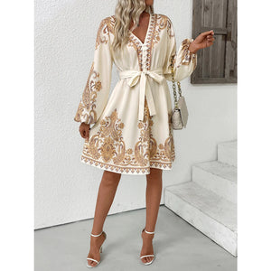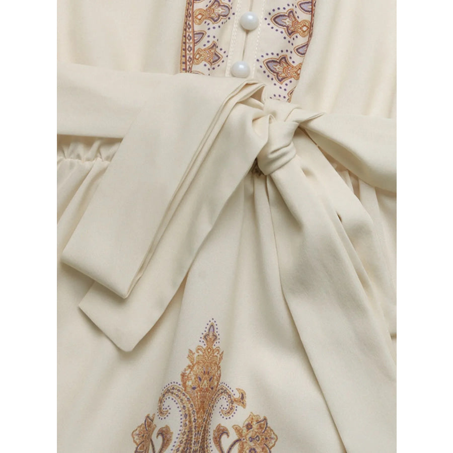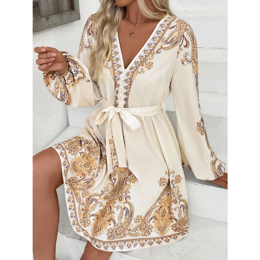Printed Tie Waist Long Sleeve Dress