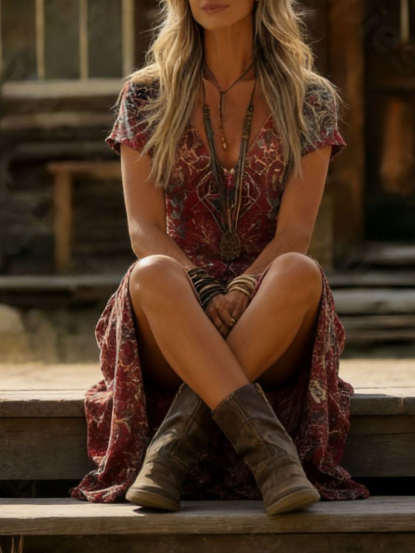 Printed V-Neck Short Sleeve Midi Dress