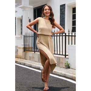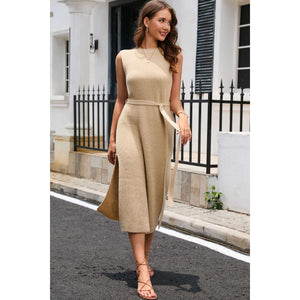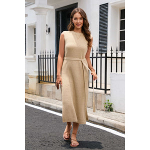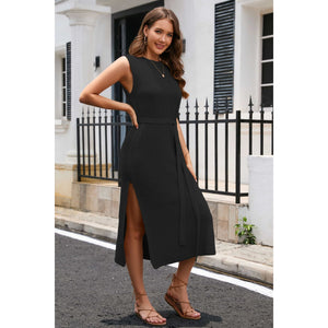 Round Neck Tie Belt Slit Sleeveless Sweater Dress