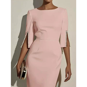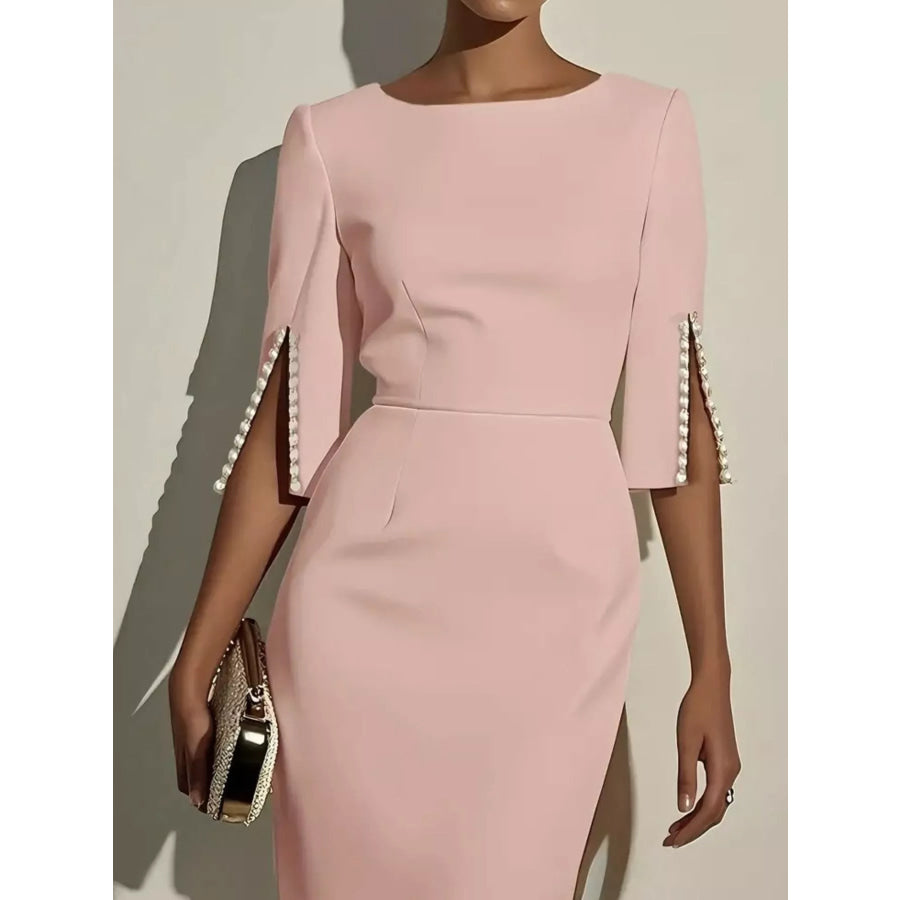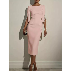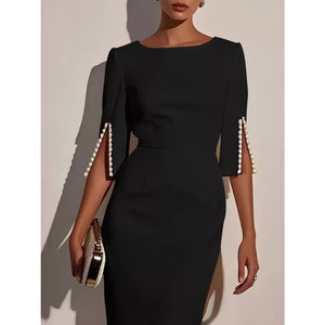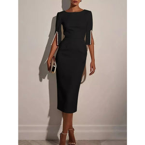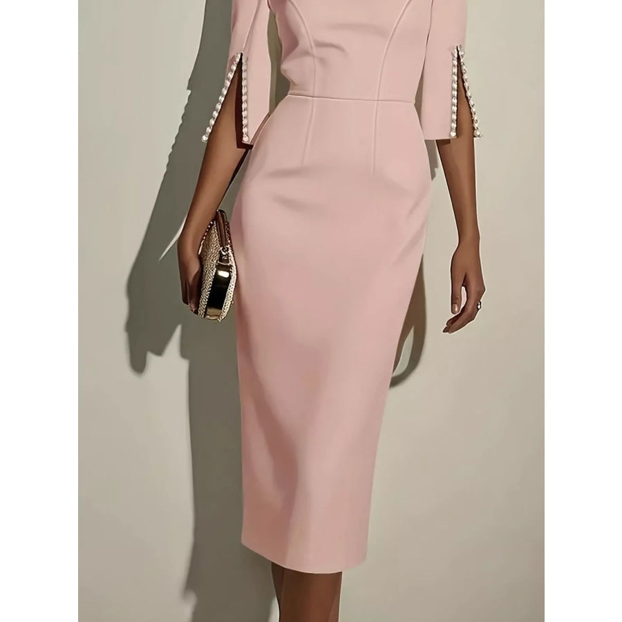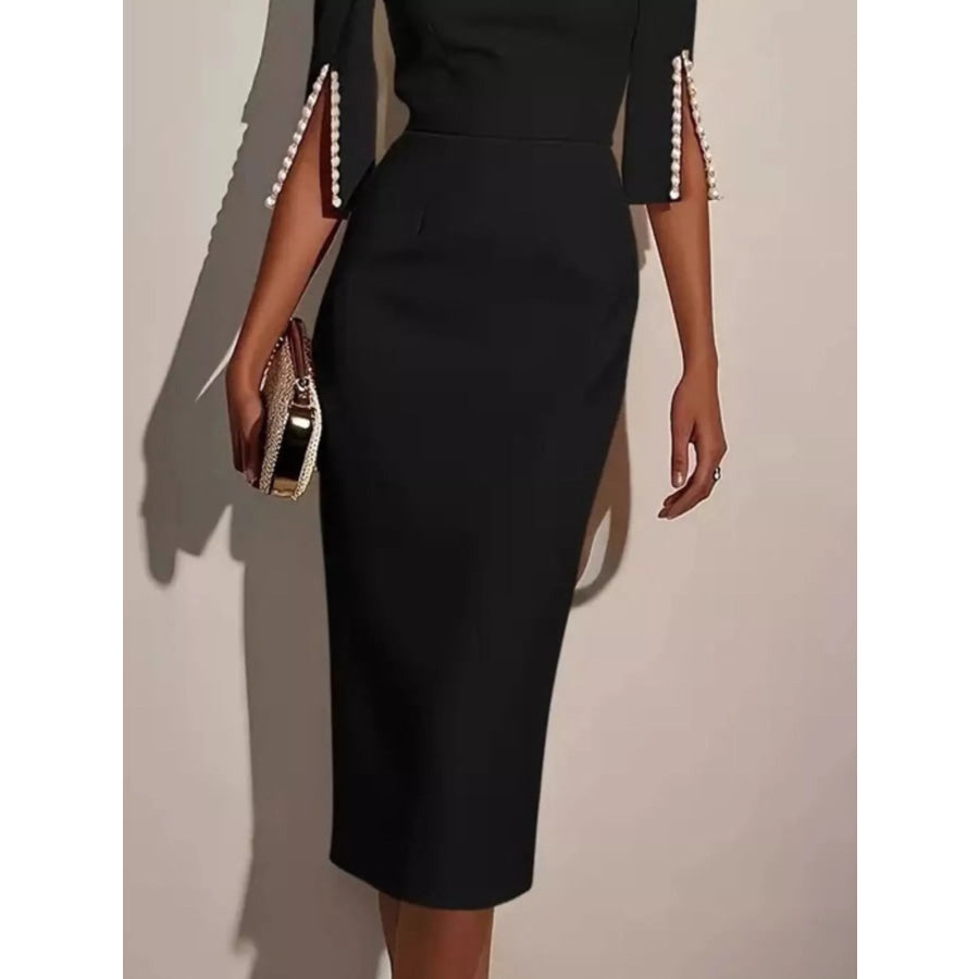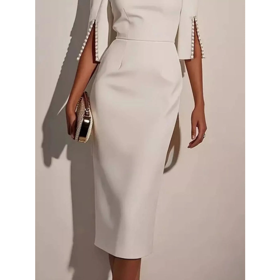 Slim-Fit Elegant Midi Dress with Beaded Slit Sleeve