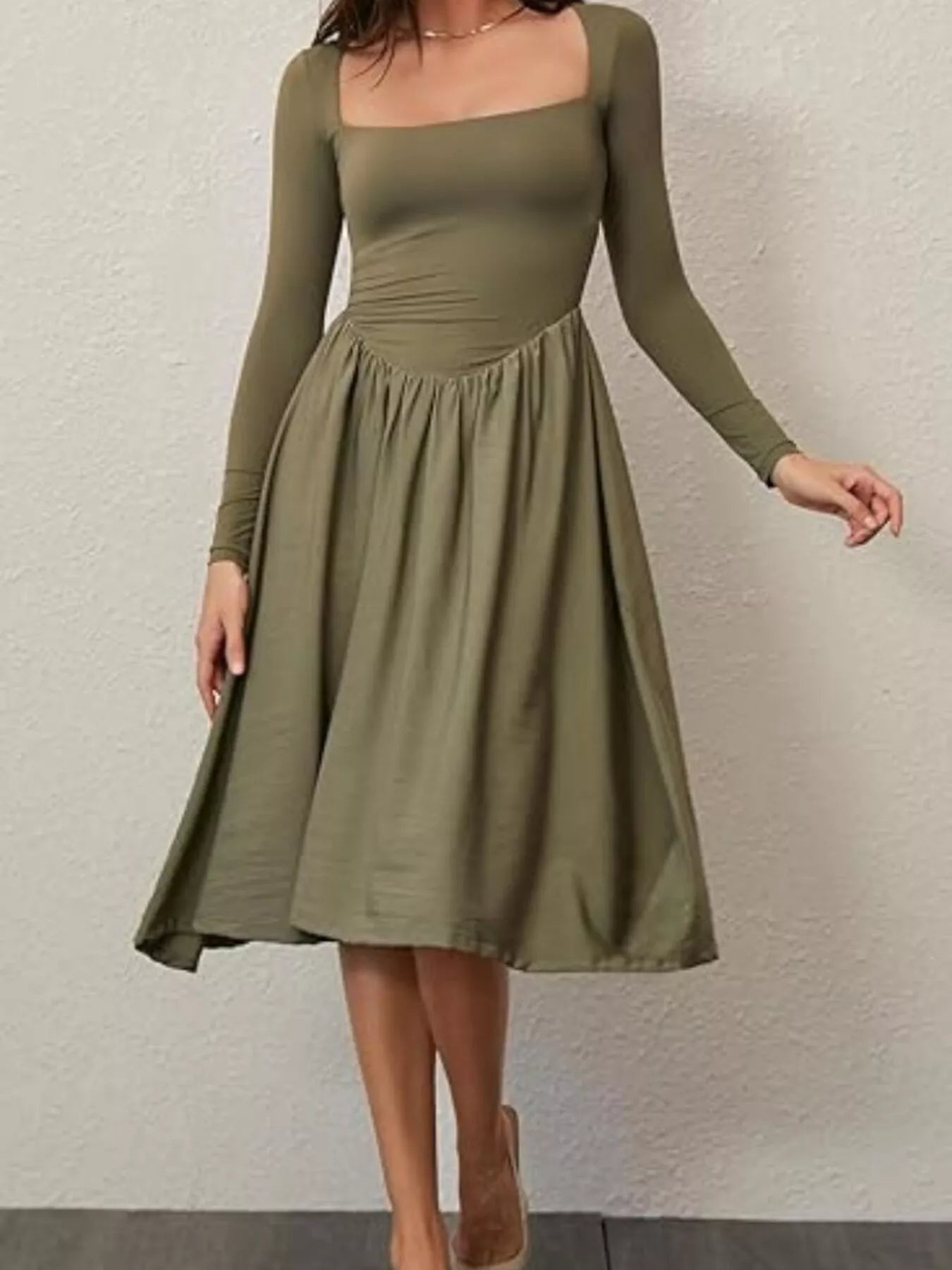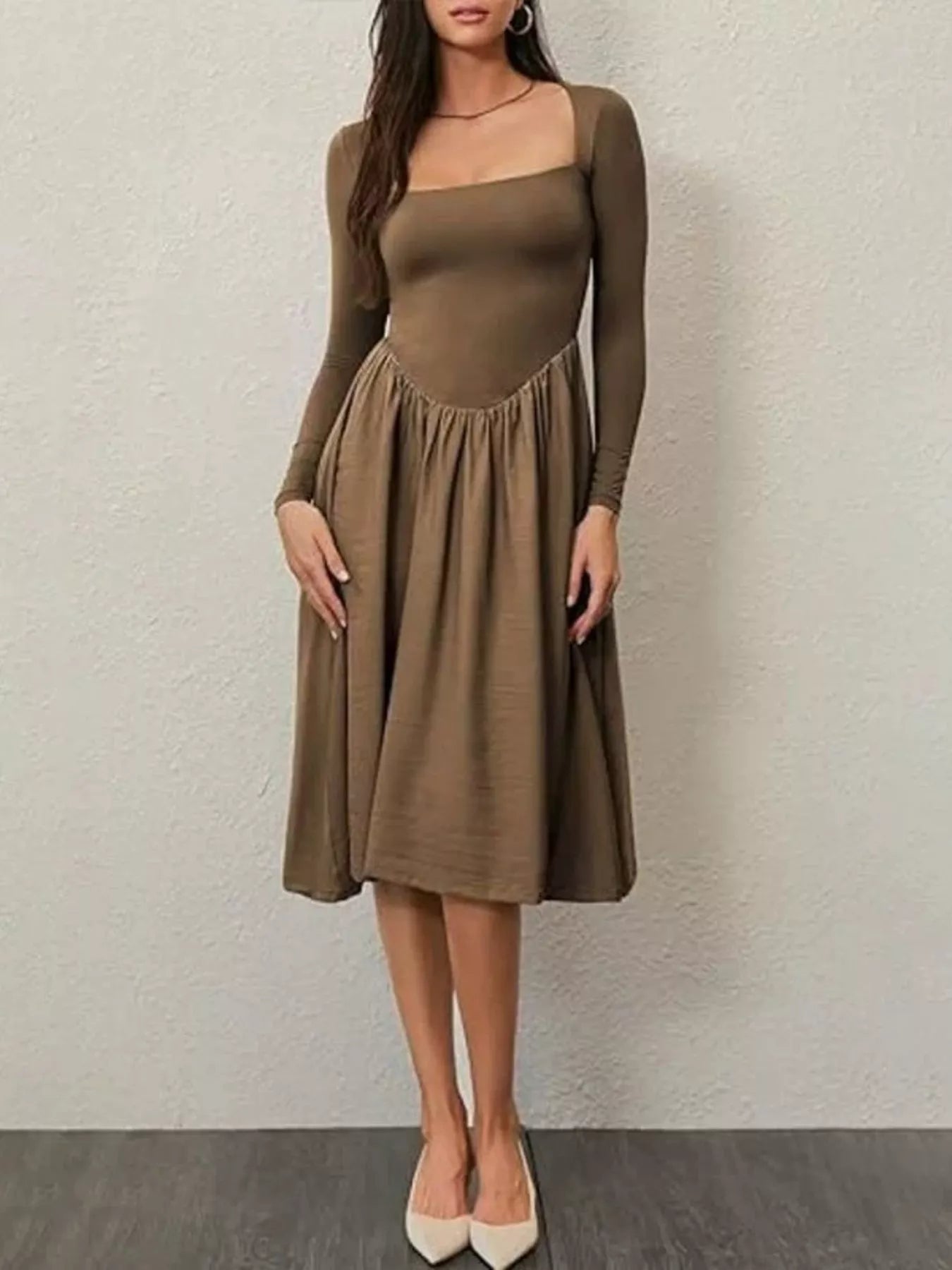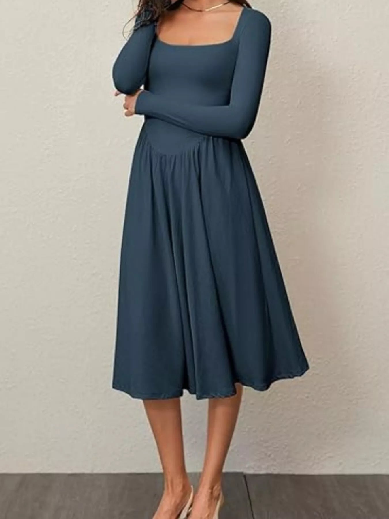 Square Neck Long Sleeve Midi Dress