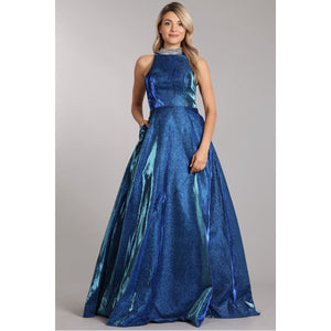 Full length textured evening gown with pockets, high neck, and rhinestone collar.