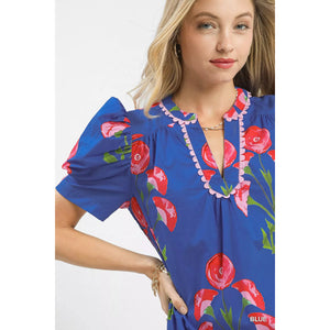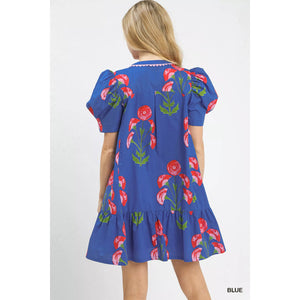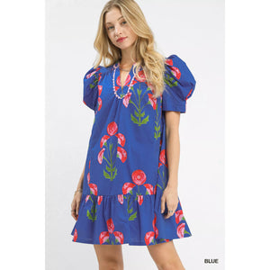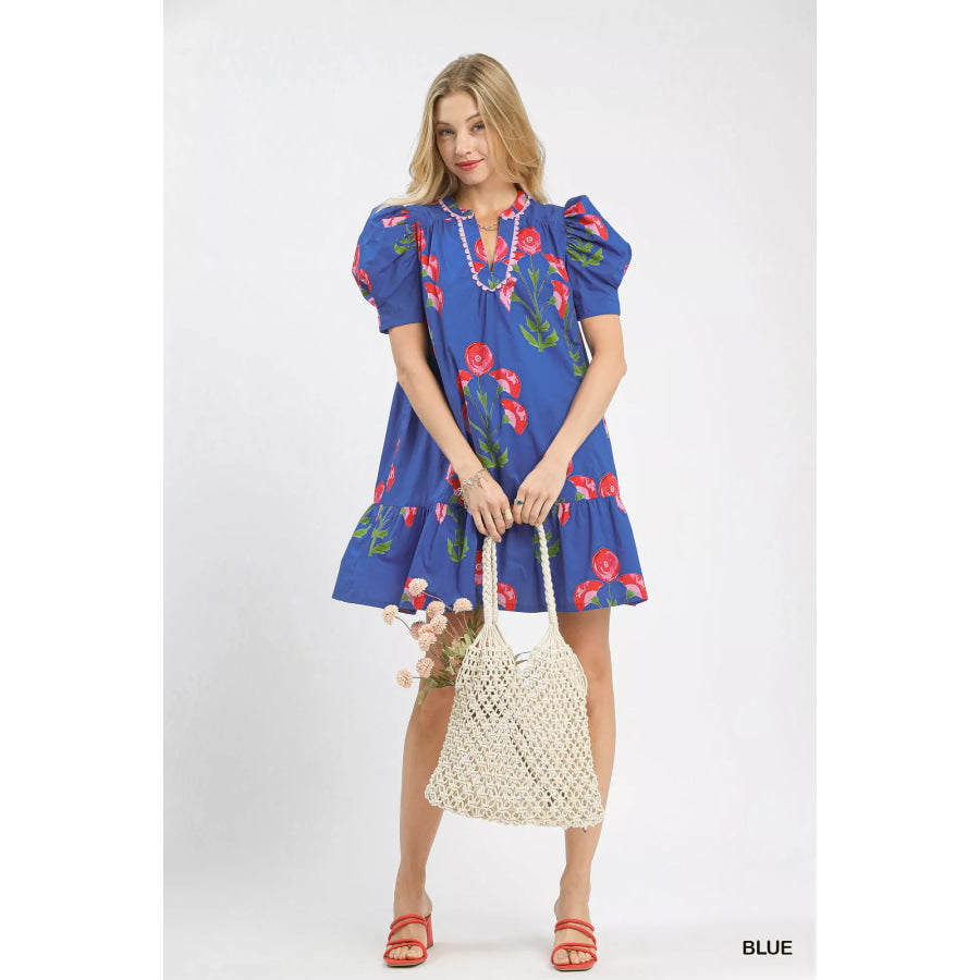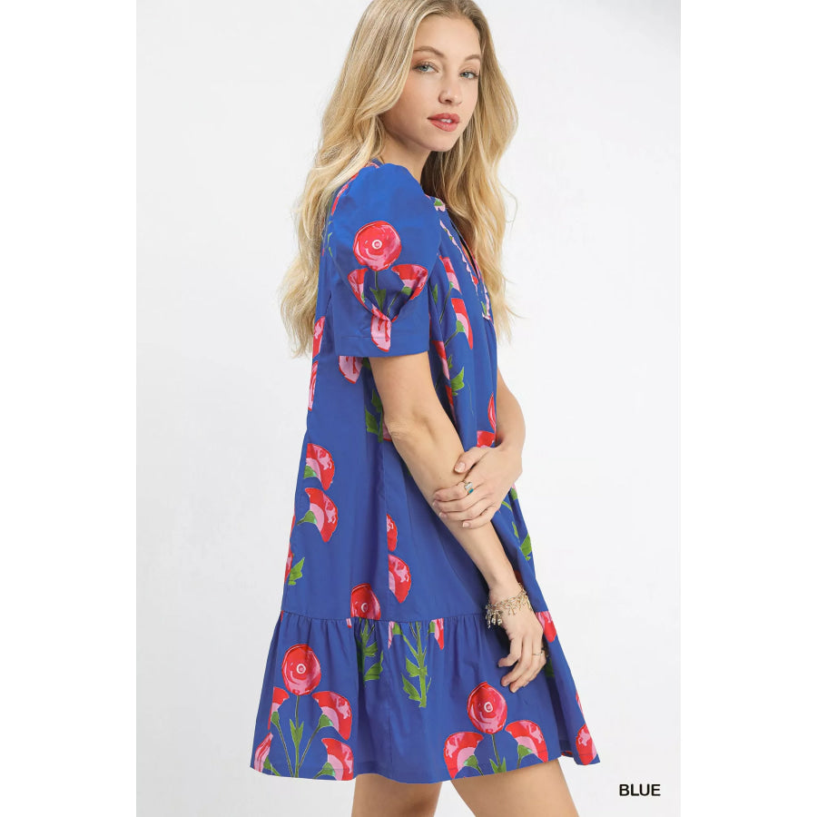 Umgee Floral Print Puff Sleeve Mini Dress with Scallop Trim