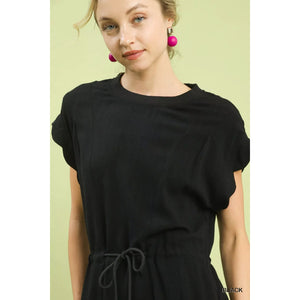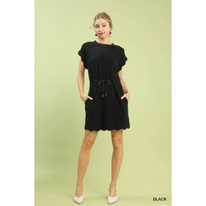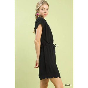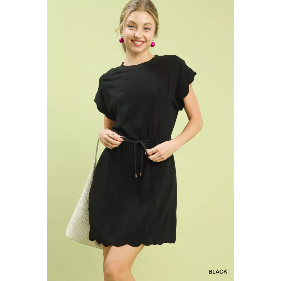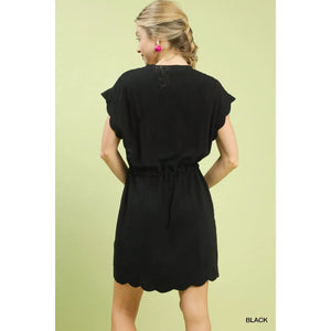This Umgee cerulean linen blend mini dress is the perfect blend of style and comfort. The solid color and drawstring waist create a flattering silhouette. The round crew neck and short flutter sleeves with scallop detail add a feminine touch. The scalloped hemlines give the dress a unique and playful edge. Ideal for a casual yet chic look for warm weather outings.