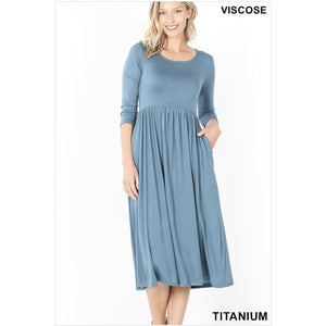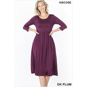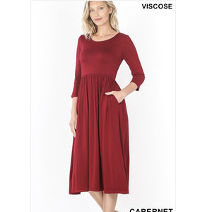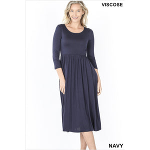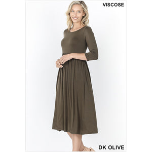 Zenana Viscose 3/4 Sleeve Dress With Waist Shirring and Pockets