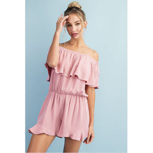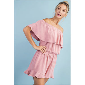 An off the shoulder romper with a ruffle trim and cinched waist made in a soft linen fabric. Complemented with a ruffle trim on the bottom.