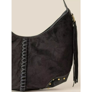 This striking black shoulder bag combines edgy sophistication with practical functionality. Crafted from premium faux leather material, it features a distinctive hobo silhouette with a unique braided center panel that adds visual interest and texture. The bag is adorned with metallic studs along the bottom edge, creating a rock-inspired aesthetic perfect for fashion-forward individuals. The adjustable shoulder strap ensures comfortable wear, while the spacious interior accommodates daily essentials. A decorative tassel detail adds movement and style, making this bag ideal for both casual and dressy occasions. The curved bottom design maximizes storage capacity while maintaining an elegant profile.