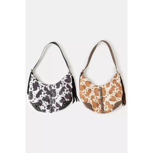 This stylish Western-inspired shoulder bag features an eye-catching cowhide print pattern in classic brown and white coloring. Crafted from durable faux leather material, it showcases a spacious hobo-style silhouette perfect for daily use. The bag is enhanced with decorative metal studs along the edges and features an adjustable shoulder strap for comfortable carrying. Additional tassel details add a fashion bohemian touch, while the single-compartment design offers ample storage space for essentials. The authentic cowhide pattern gives it a distinctive Western ranch aesthetic, making it perfect for casual outings and adding a unique statement piece to any outfit.