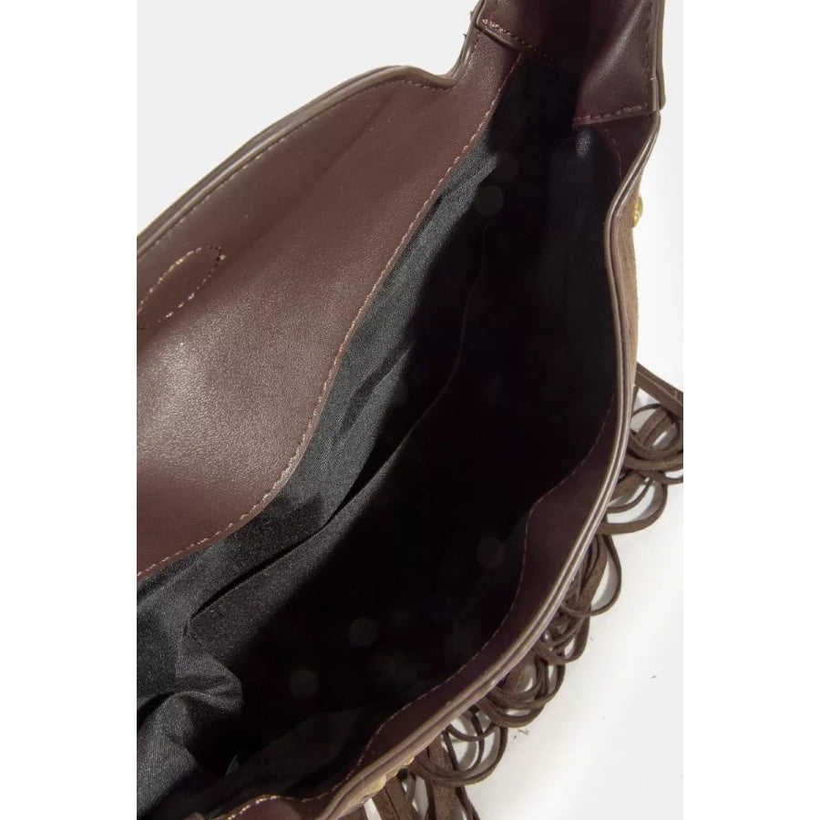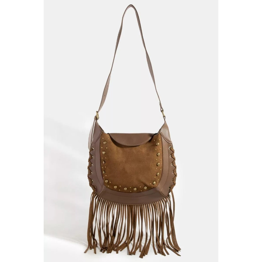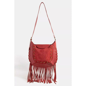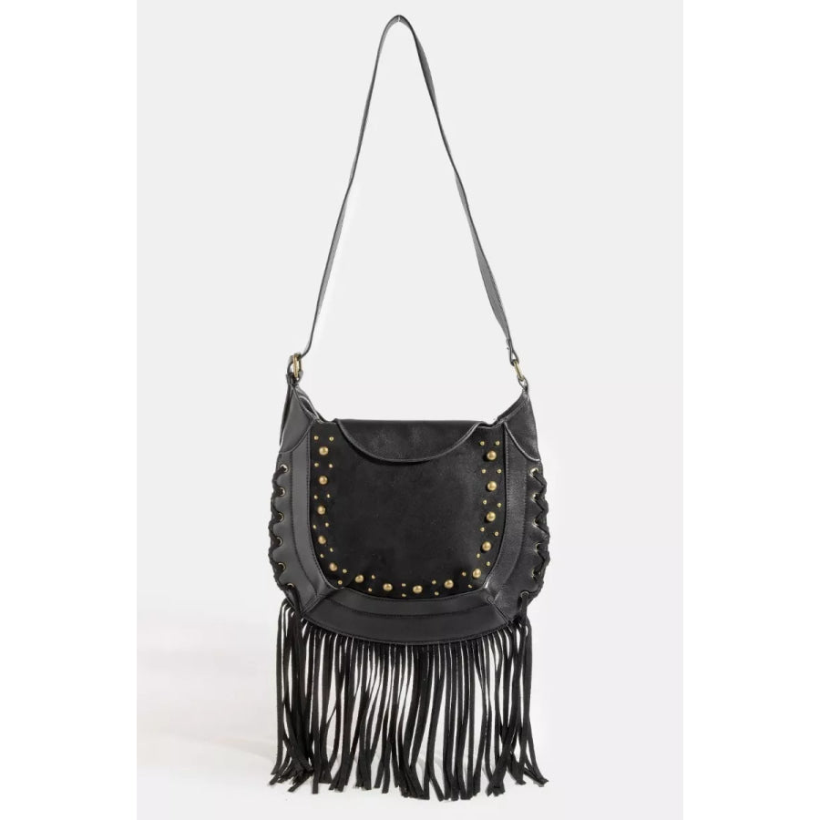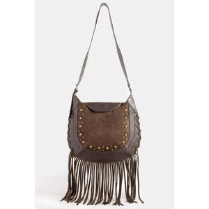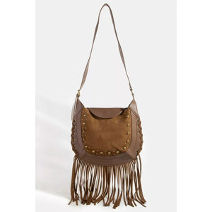 Fame Rivet Trim Suede Fringe Shoulder Bag