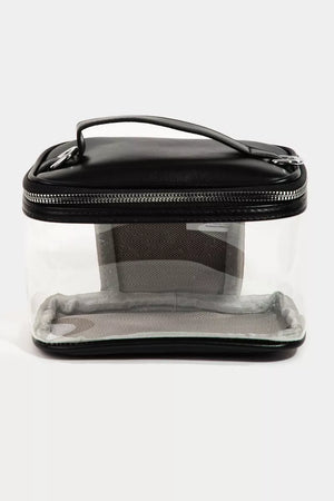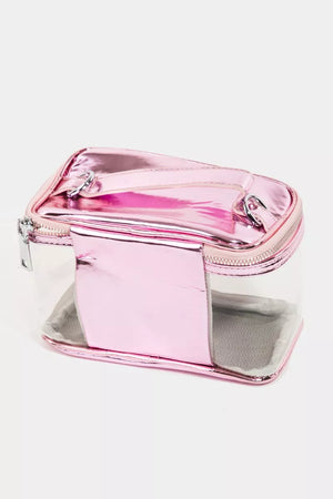 This clear travel handbag combines practicality with a touch of glamour. The transparent design allows for quick identification of contents, making it ideal for travel or everyday organization. The metallic pink trim adds a stylish and eye-catching detail. Crafted from durable materials, this handbag features a secure zipper closure and a convenient top handle for easy carrying. Perfect for storing toiletries, cosmetics, or accessories, this versatile handbag is a must-have for any stylish traveler.