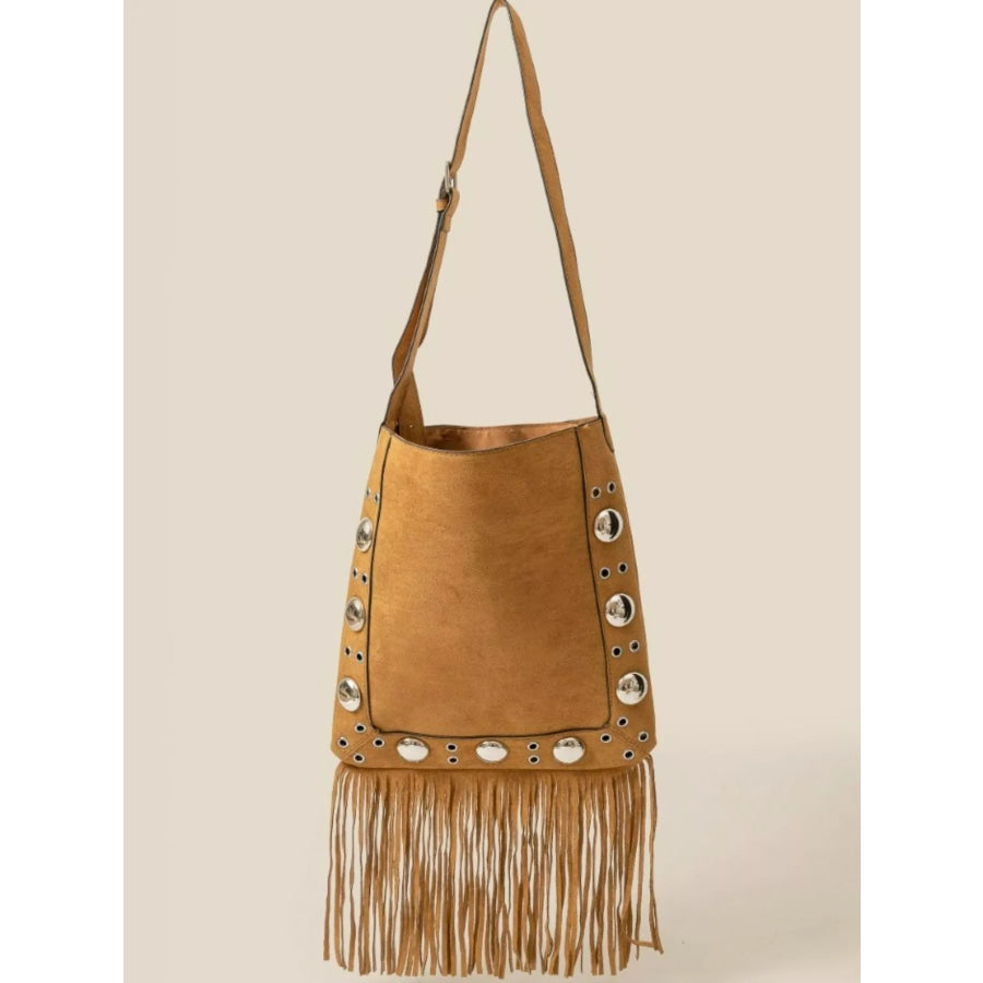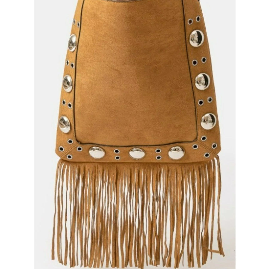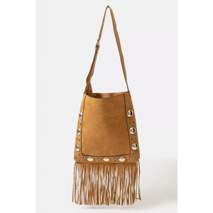This trendy tote bag features faux suede material with grommet accent detailing and fringe decoration. It's perfect for adding a touch of boho-chic style to any outfit. The spacious interior and multiple pockets make it practical for carrying your essentials. Whether for a casual day out or a fun night with friends, this tote bag is a fashionable choice. Get ready to turn heads with this stylish and versatile accessory!
