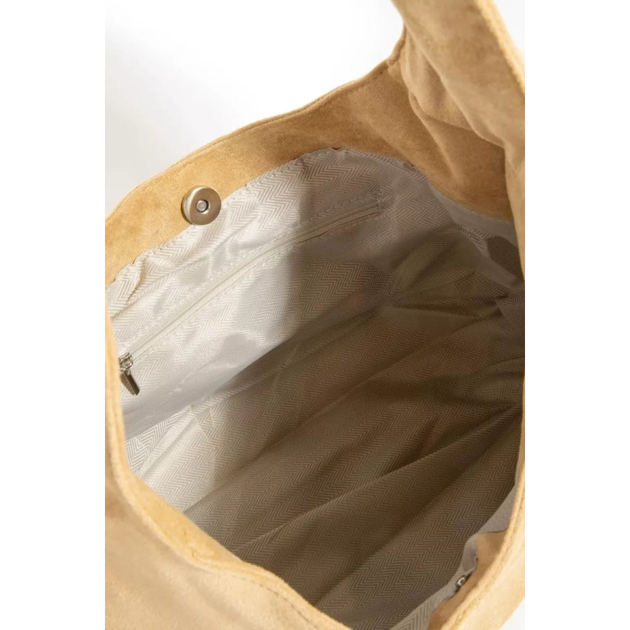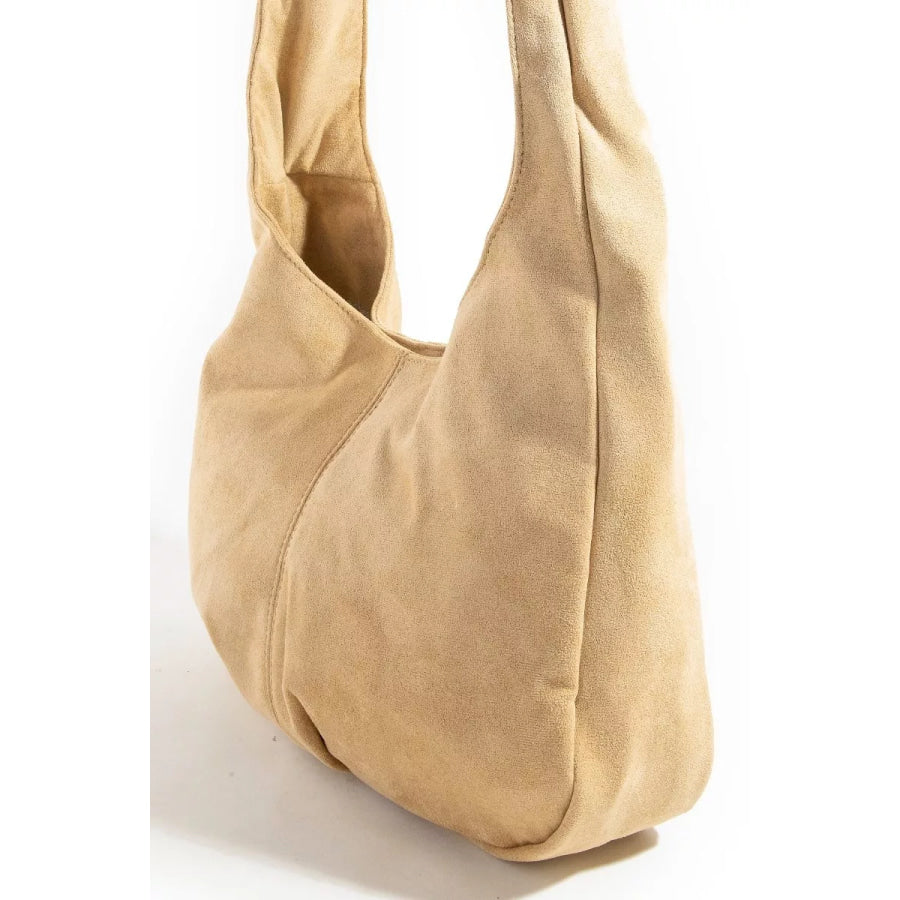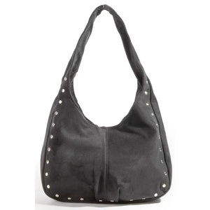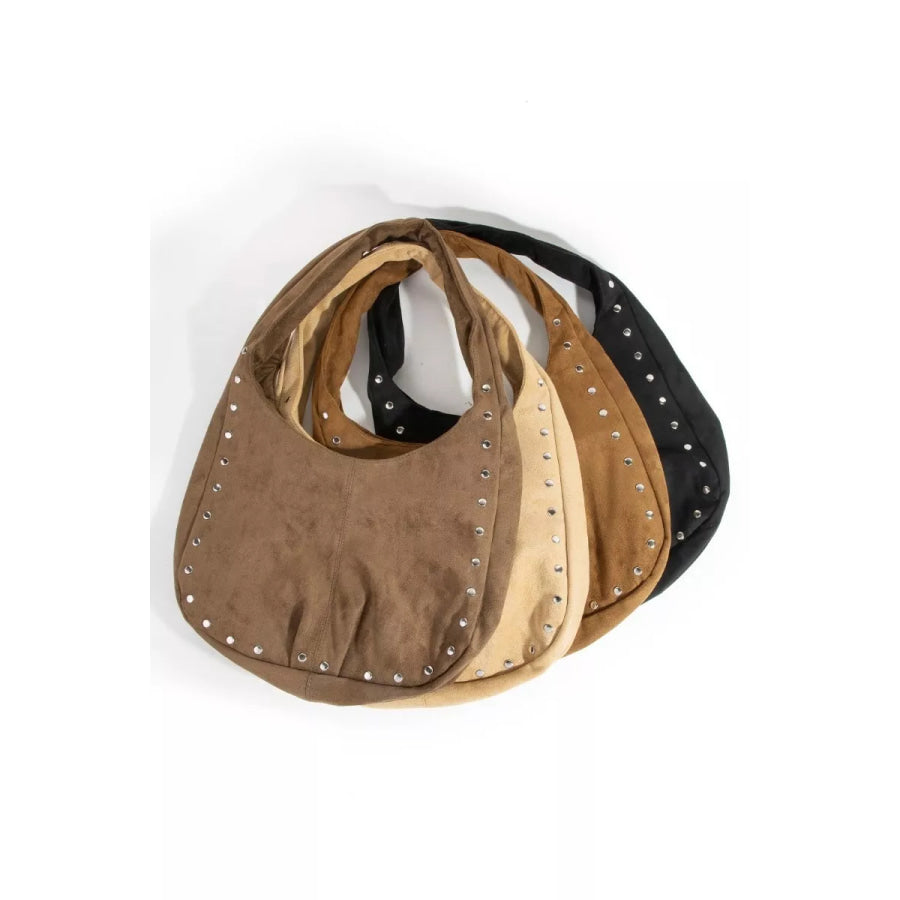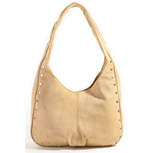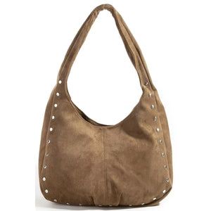 This stylish shoulder bag is crafted from soft suede material and features eye-catching rivet accents along the edges. The hobo style design offers a relaxed and comfortable fit on the shoulder, while the spacious interior provides ample room for everyday essentials. The neutral color makes it a versatile accessory that can be paired with a variety of outfits. Perfect for adding a touch of edgy sophistication to any look.