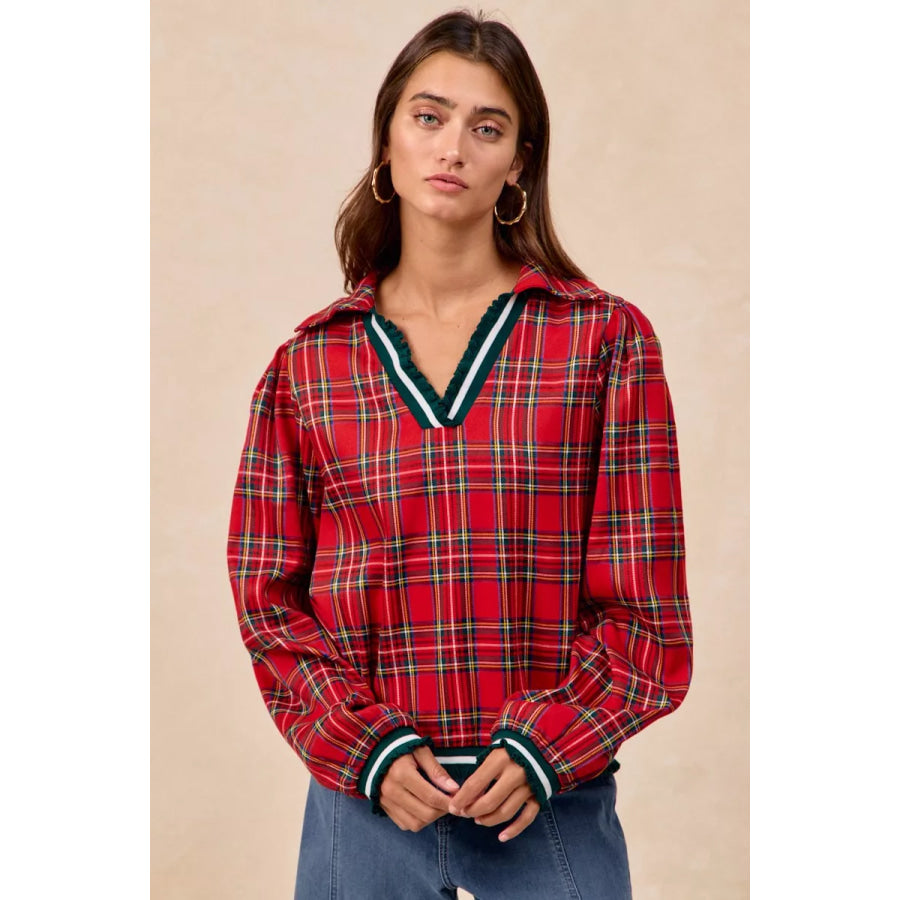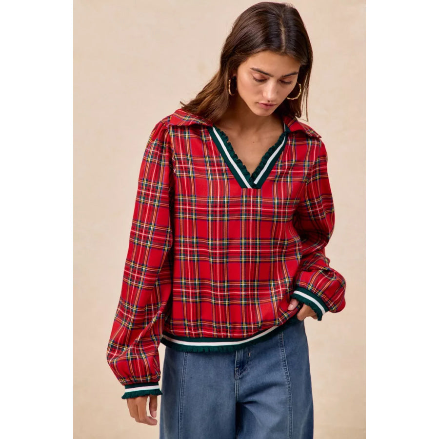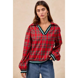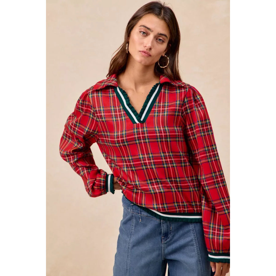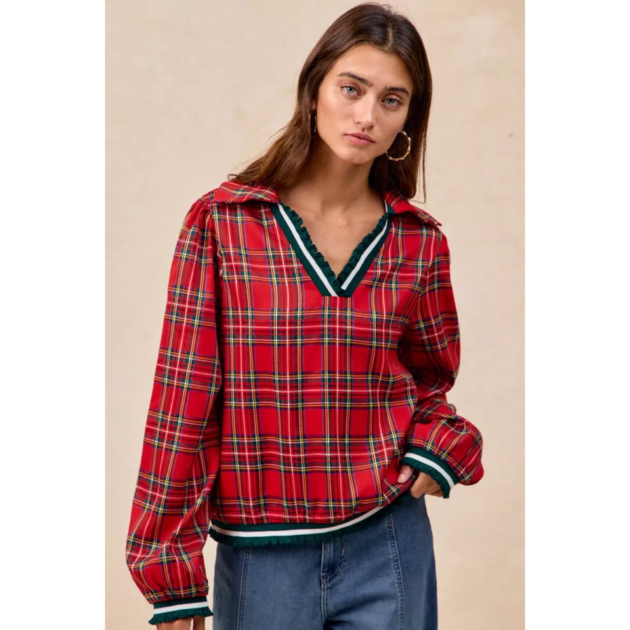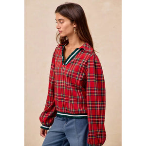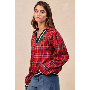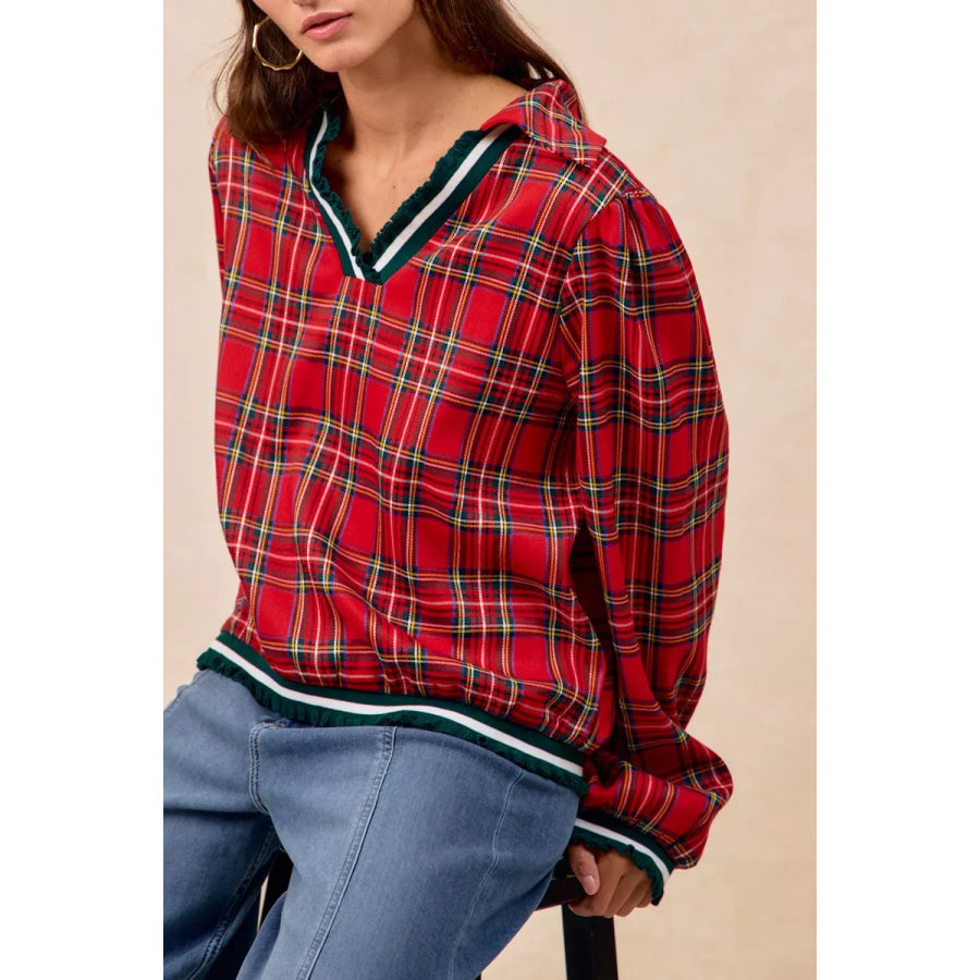 BiBi Christmas Plaid Collared Top with Ruffled Detail
