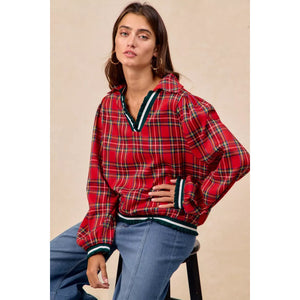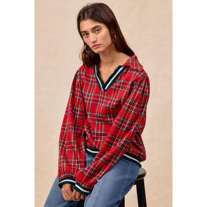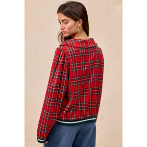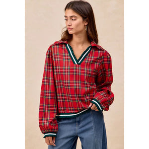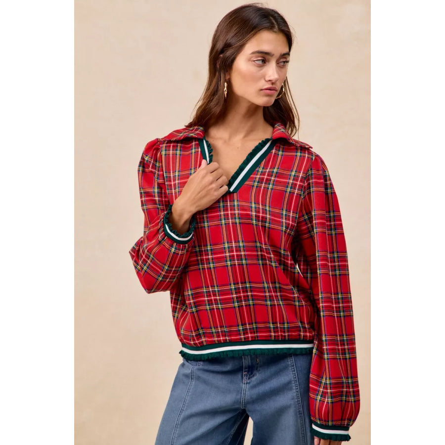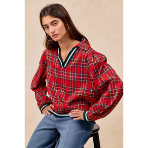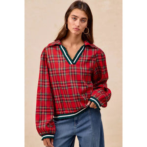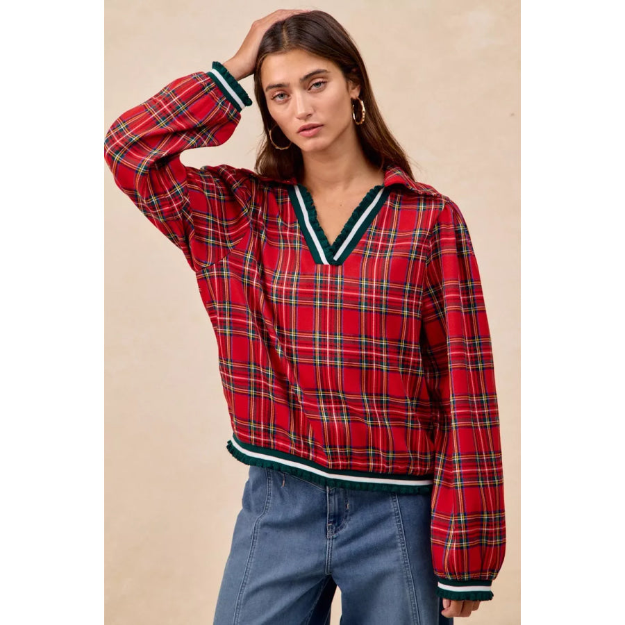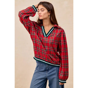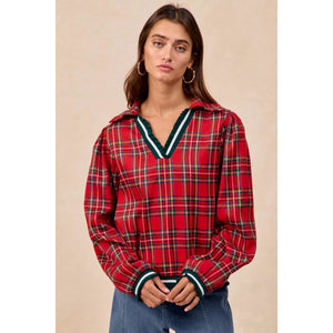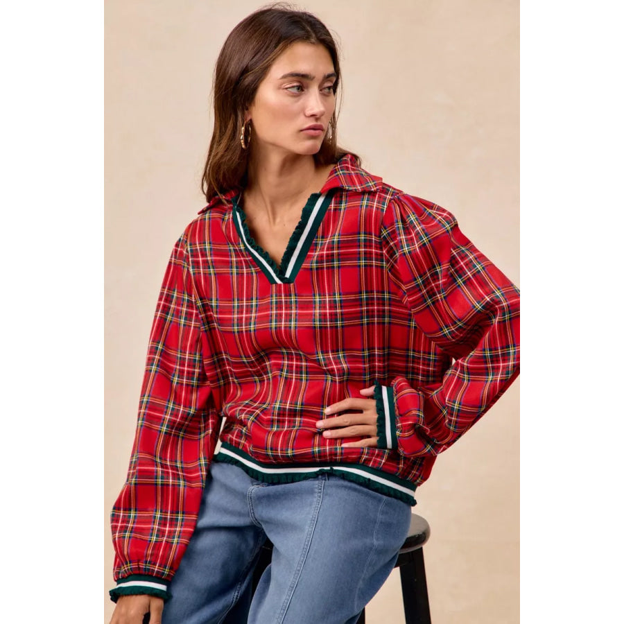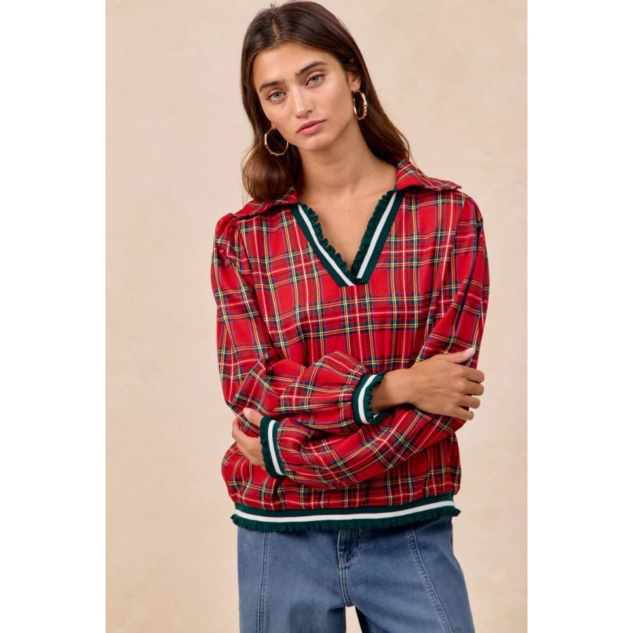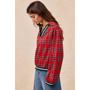 BiBi Christmas Plaid Collared Top with Ruffled Detail