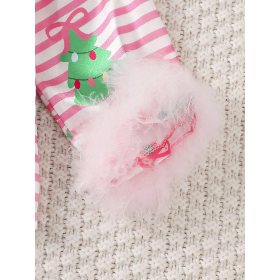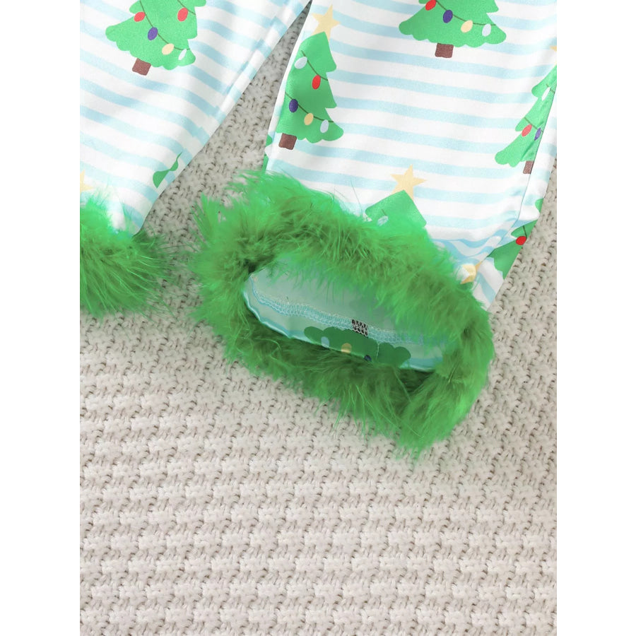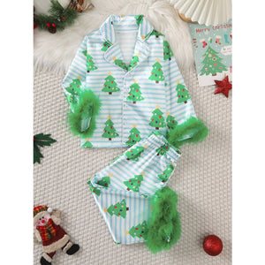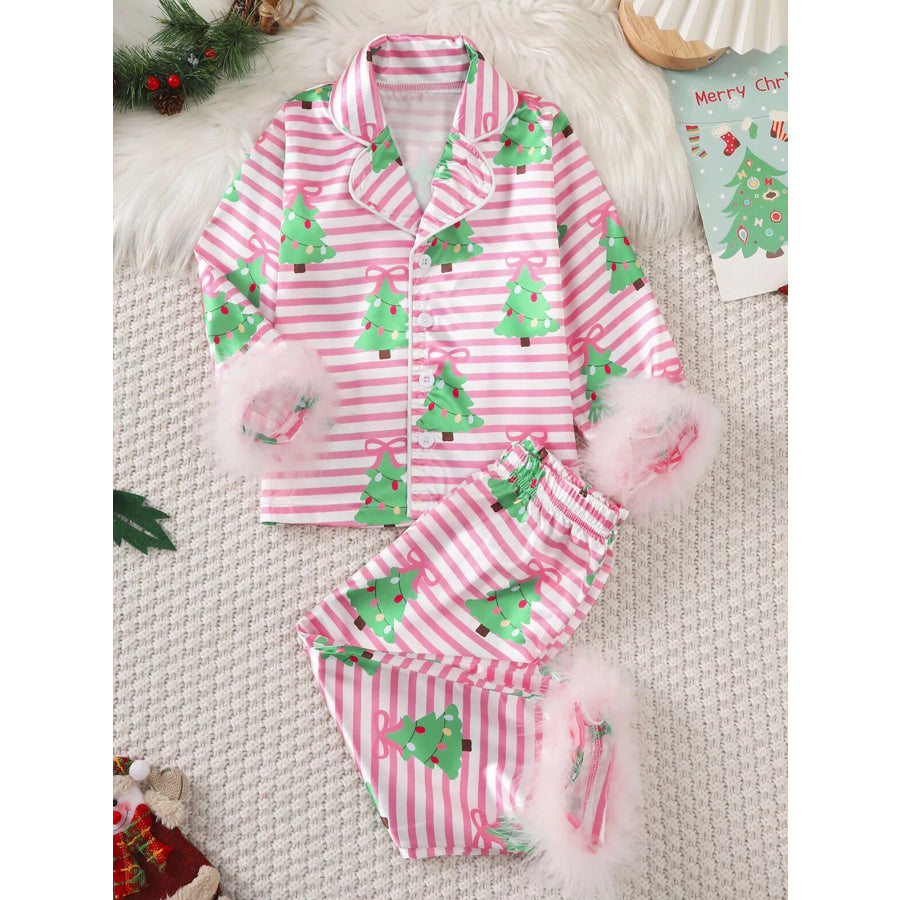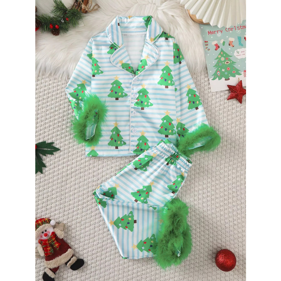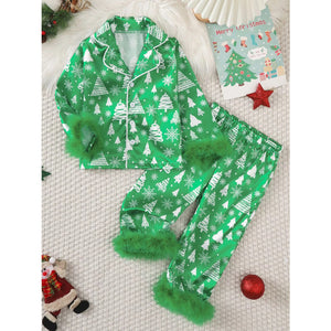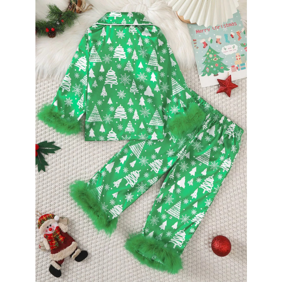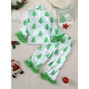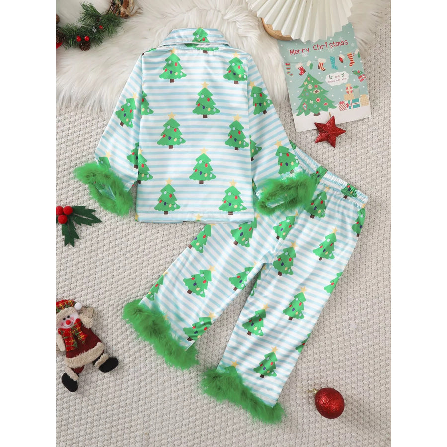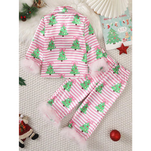 Children's Christmas Tree Print Fluffy Cuff Pajama Set