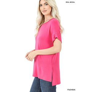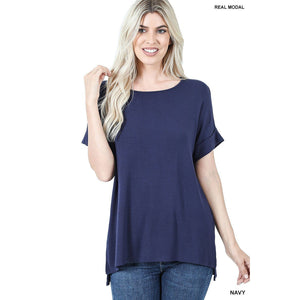 Luxe Modal Short Sleeve Boat Neck Top with High-Low Hem
