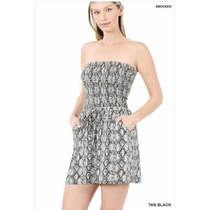 Snake Print Smocked Bandeau Romper with Pockets - Tan Black