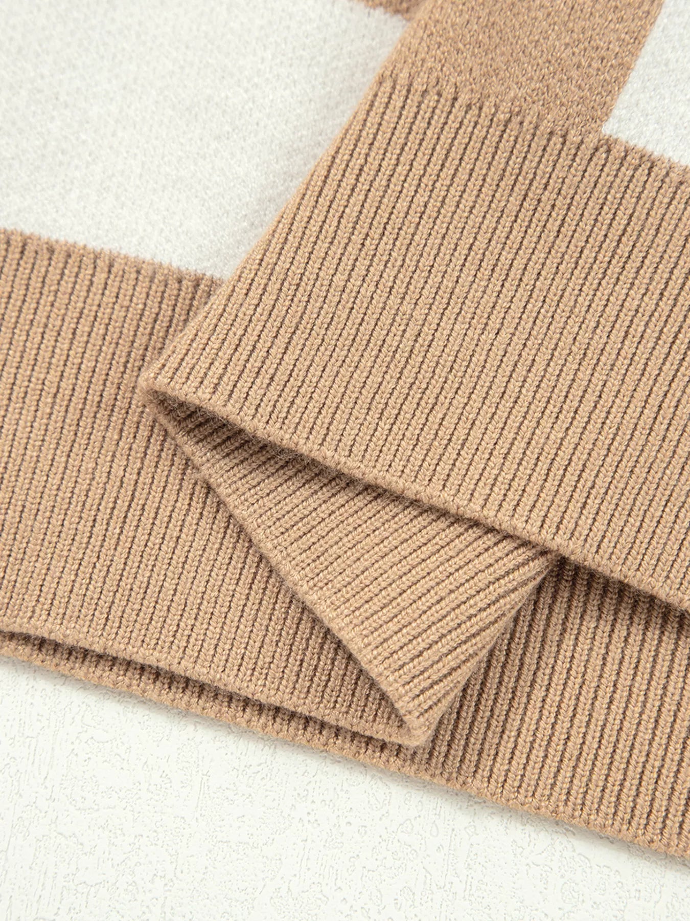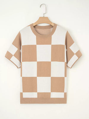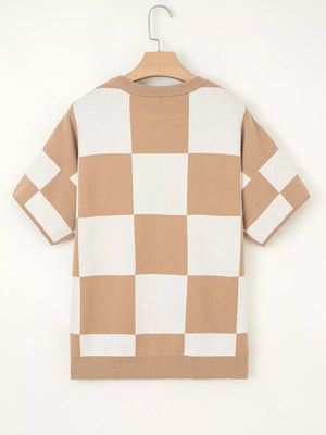 Checkered Pattern Loose Drop Shoulder Half Sleeve Sweater
