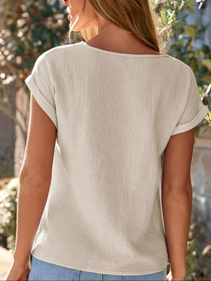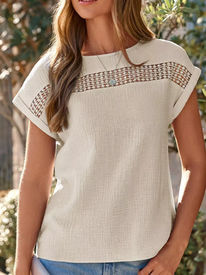 Crochet Insert Textured Cotton Short Sleeve Blouse Top