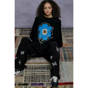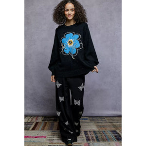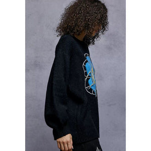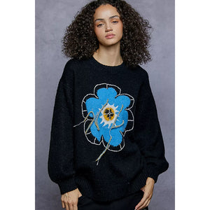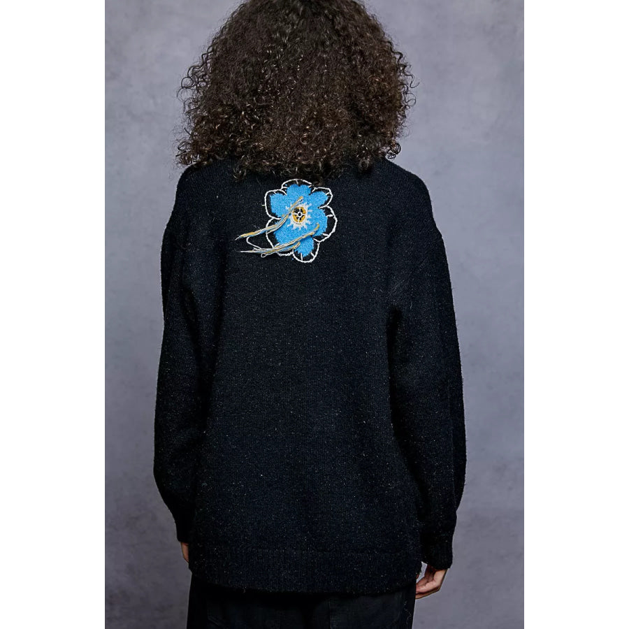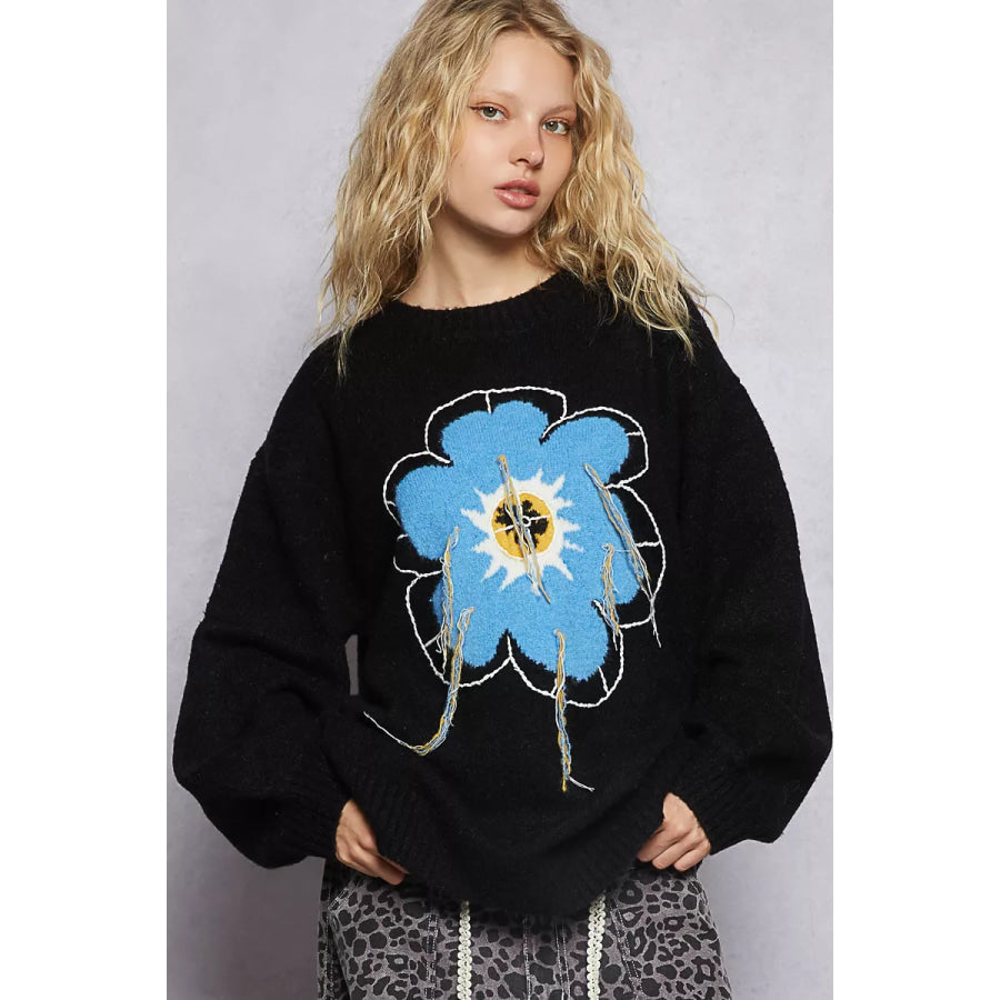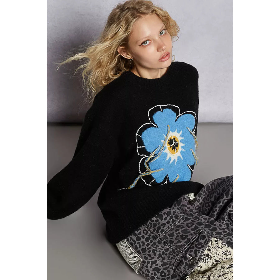 The Designed in round neck long sleeve relaxed fit sweater offers a blend of comfort and style, crafted from acrylic for a soft and cozy feel. This sweater showcases a striking contrast floral pattern that adds a touch of charm and uniqueness to the design. Exposed stitching and fringe detailing provide a modern and playful twist to this classic piece. With a relaxed fit, round neckline, and long sleeves, this sweater is perfect for layering and creating effortless outfits. Add a touch of whimsy to your wardrobe with this trendy and versatile sweater that will keep you warm and fashionable all season long.