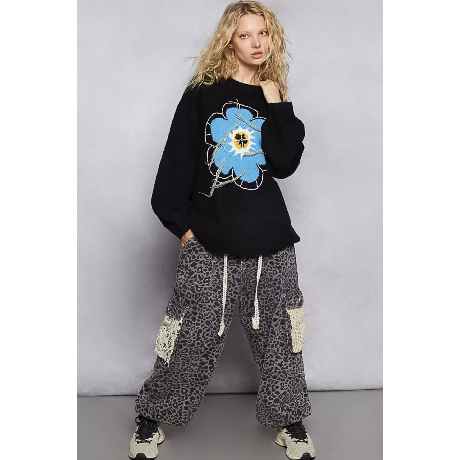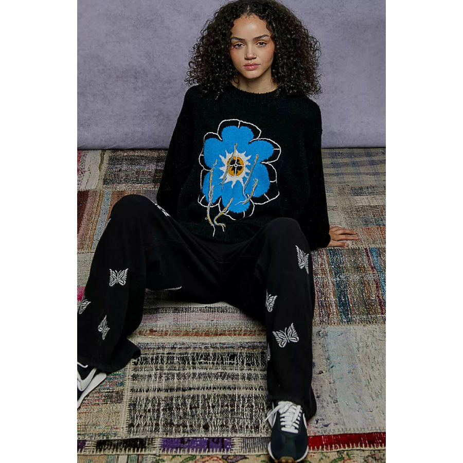 POL Floral Pattern Round Neck Sweater with Exposed Stitching