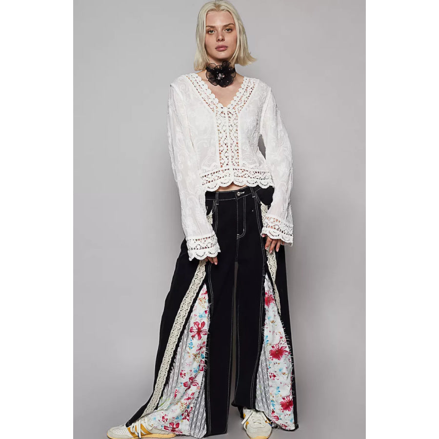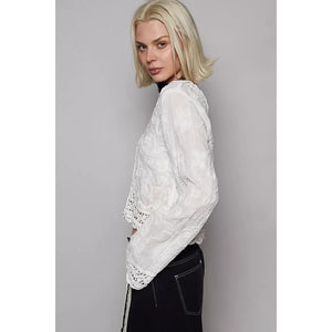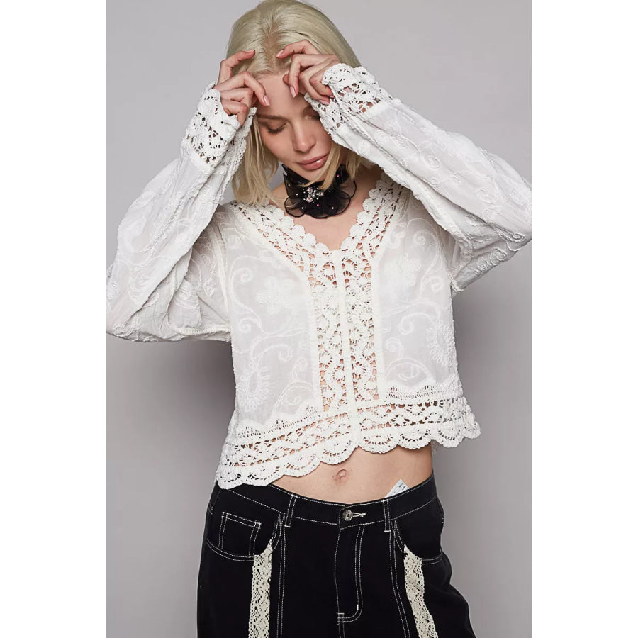 POL Long Sleeve Cropped Crochet Top with Floral Embroidery Detail