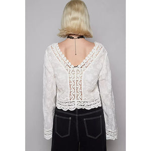 This V-neck long sleeve cropped fit top is a trendy and feminine piece, featuring intricate crochet with various weave knit patterns. The floral embroidery detailing adds a charming and elegant touch to the design. Perfect for dressing up or down, this top offers a stylish and versatile option for various occasions. The cropped fit adds a modern twist, making it a statement piece in any outfit. Elevate your look with this chic and detailed crochet top that effortlessly combines style and sophistication.