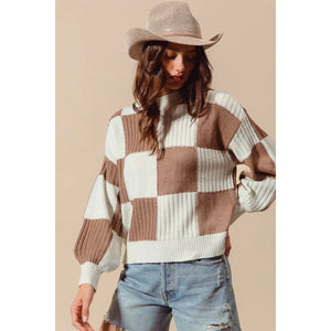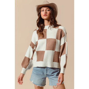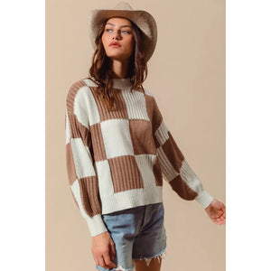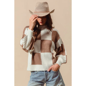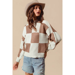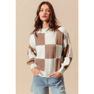 SO ME Ribbed Color Block Checkered Plaid Sweater
