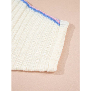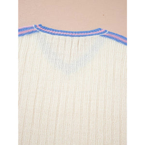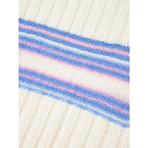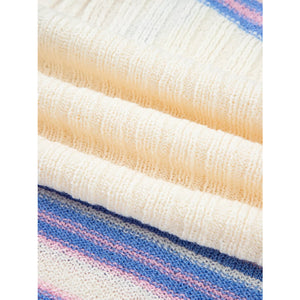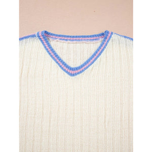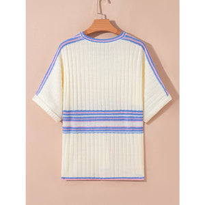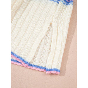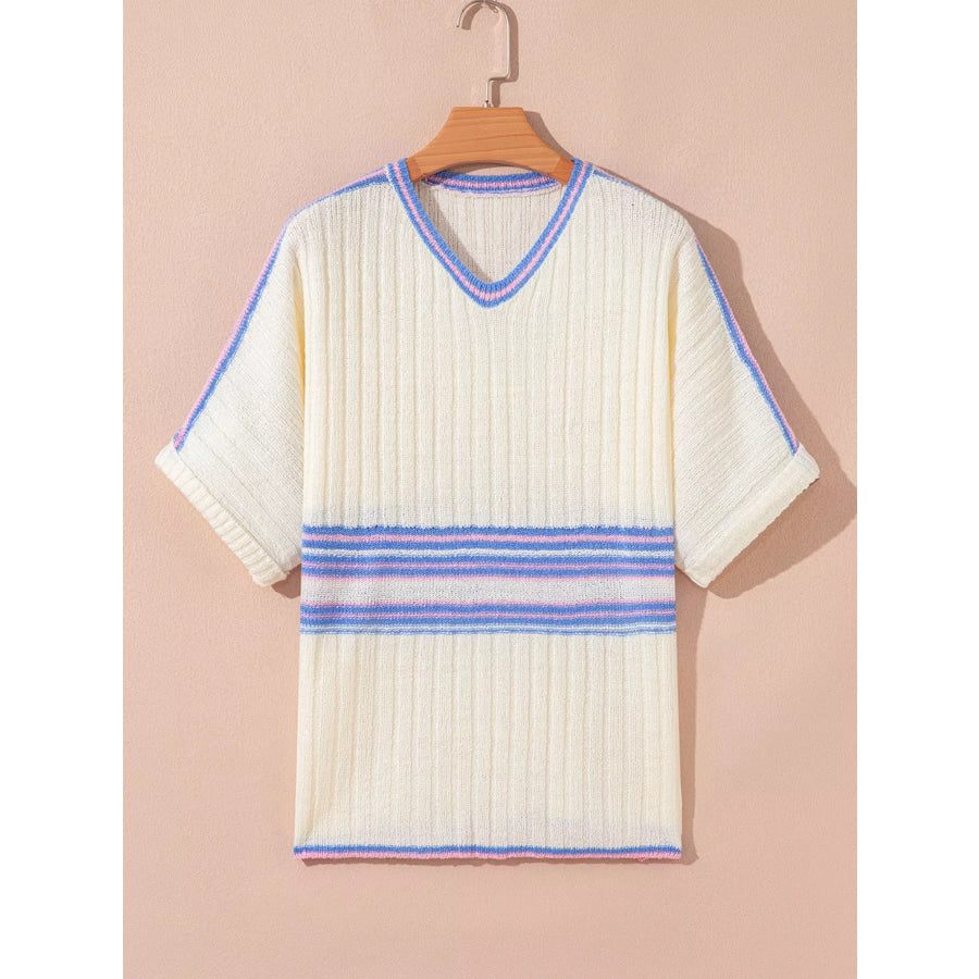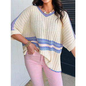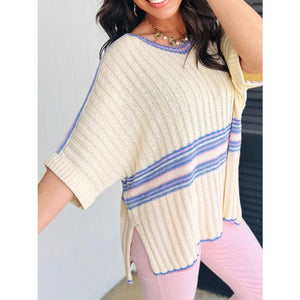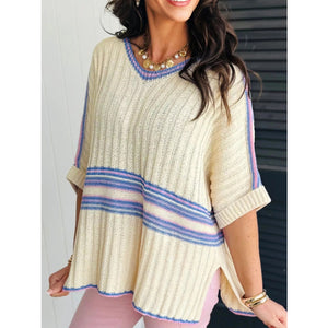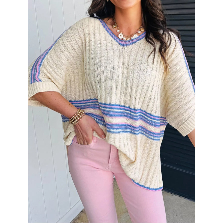 Striped V Neck Dolman Sleeve Rib Knit Oversized Sweater with Slits