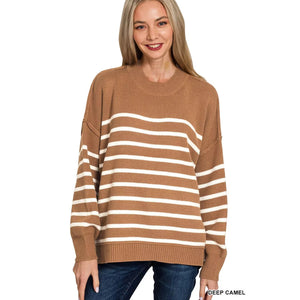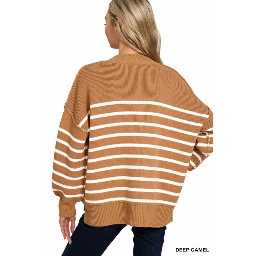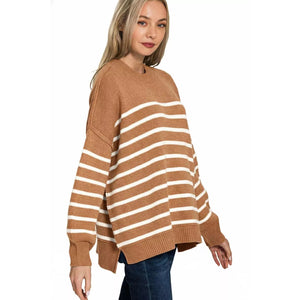 Stay effortlessly chic and cozy in this oversized sweater with exposed seam details and a stylish striped pattern. The exposed seams add a modern touch to the classic design, making it a versatile piece for your wardrobe. The loose and relaxed fit ensures comfort and ease of movement. Perfect for layering over your favorite jeans or leggings for a casual and on-trend look. Elevate your sweater game with this fashion-forward and comfortable option.