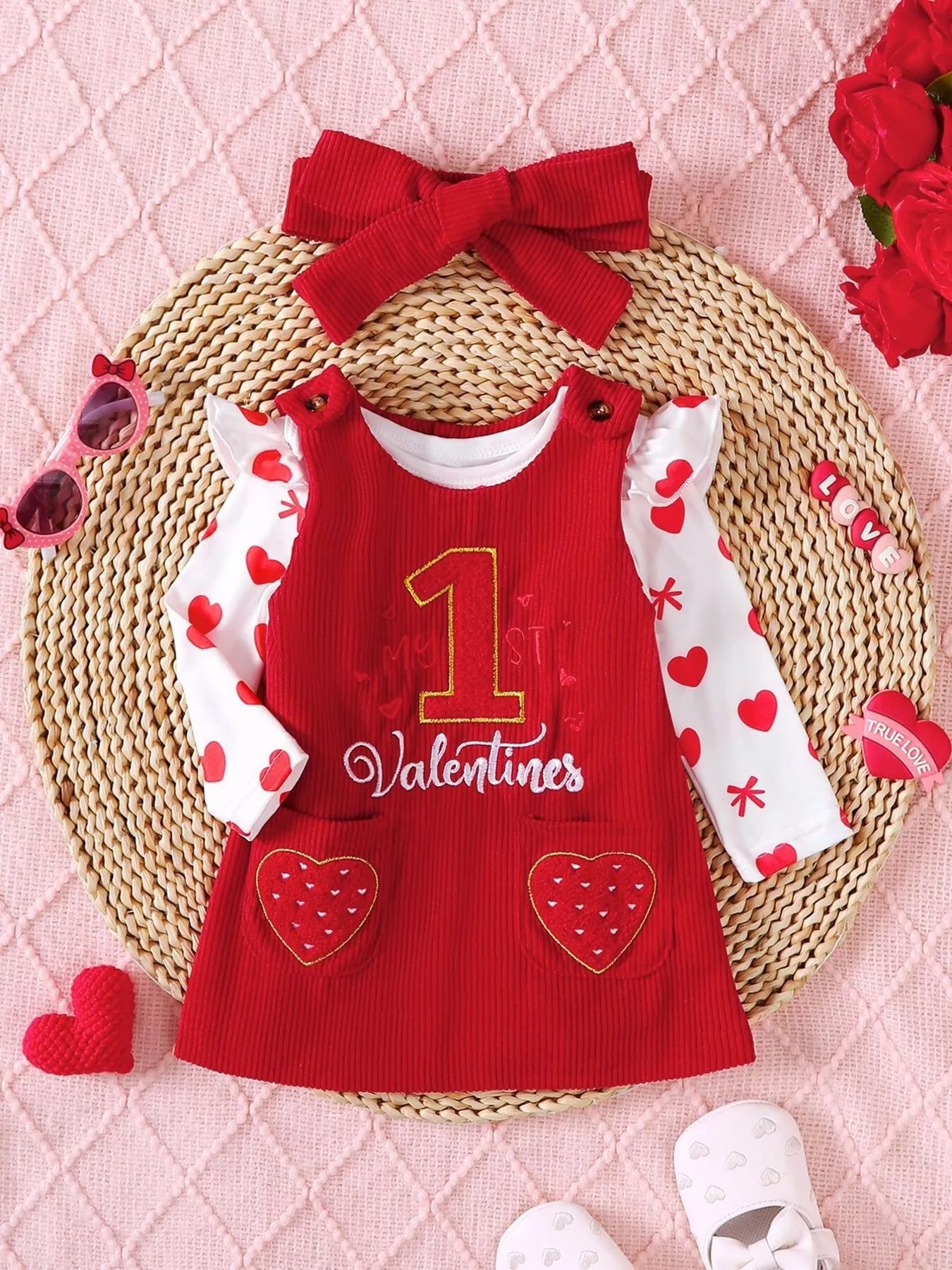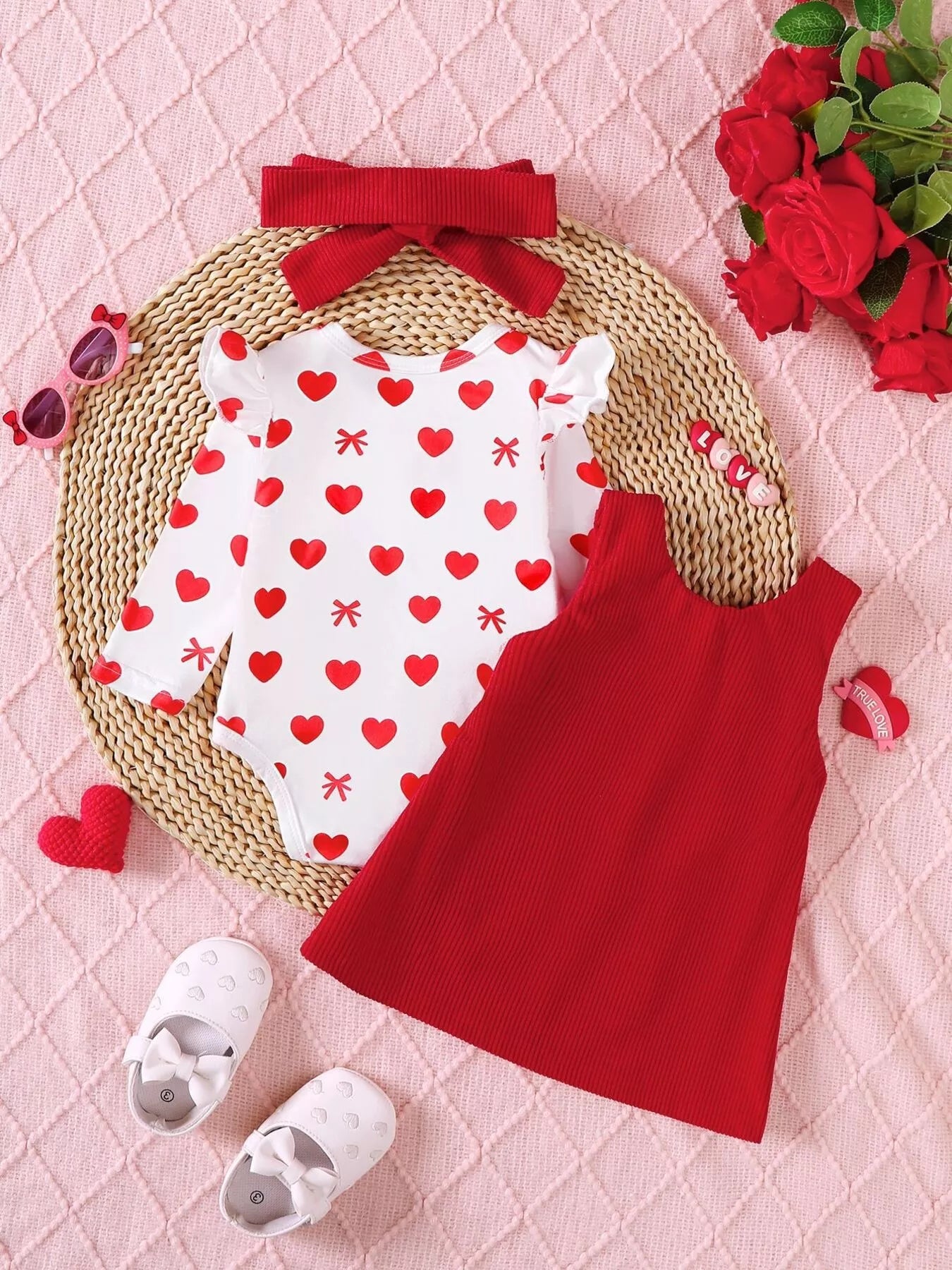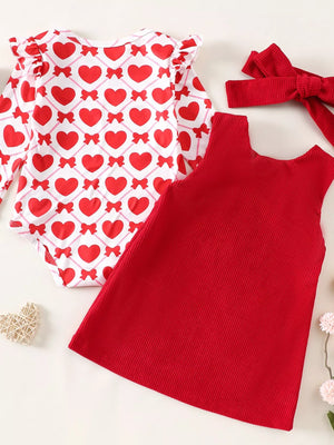 Children's Heart Print Bodysuit and Dress Outfit Set with Headband