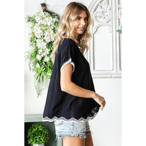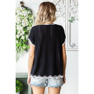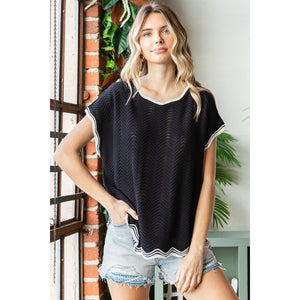 First Love Full Size Contrast Wavy Crochet Drop Shoulder Knit Top