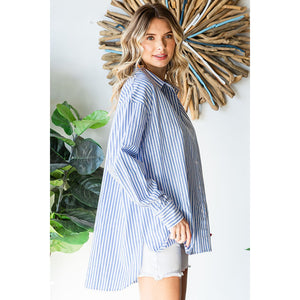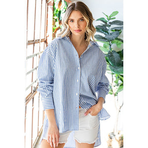 This Striped Button Down High-Low Hem Shirt is a versatile and stylish piece that will elevate your wardrobe. The classic striped pattern adds a timeless touch, while the high-low hem design gives it a modern and on-trend twist. The button-down style offers a polished and sophisticated look that can easily be dressed up or down. The shirt's lightweight and breathable fabric ensures comfort and ease of movement, making it ideal for all-day wear. Pair it with trousers for a chic office outfit or with jeans for a casual and effortless look. Stay fashionable and polished with this must-have shirt!