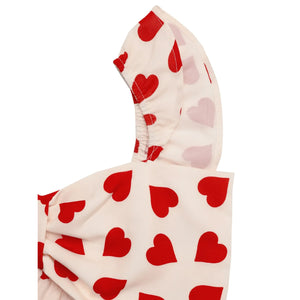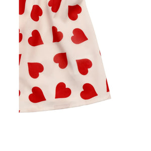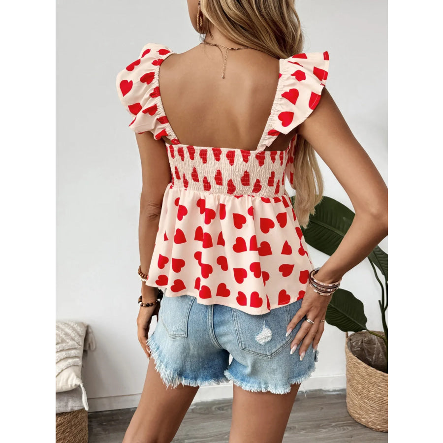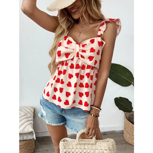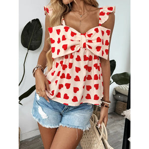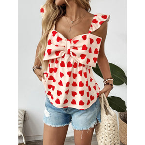 This charming peplum blouse features an all-over heart print pattern in red against a white background, creating a sweet and romantic look. The design includes a statement bow at the front, flutter cap sleeves, and a flattering peplum hem that adds feminine flair. Made from lightweight fabric suitable for warm weather wear, this blouse combines comfort with style. The sweetheart neckline and fitted waist create a figure-flattering silhouette. Perfect for casual outings, date nights, or Valentine's Day celebrations. The versatile design can be paired with jeans, shorts, or skirts for various styling options.