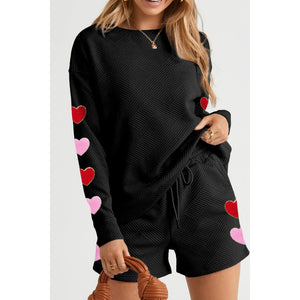 Heart Texture Round Neck Top and Drawstring Shorts Set
