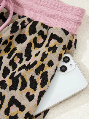 This stylish and comfortable lounge set features a fashion leopard print design with a soft knit fabric. The set includes a long-sleeved crew neck top and matching shorts with an elastic waistband and drawstring closure for a perfect fit. The pink ribbed trim adds a touch of femininity. Perfect for relaxing at home or casual outings, this set offers both style and comfort. Made from a blend of cotton and polyester for breathability and durability. The relaxed fit ensures all-day comfort, making it an ideal choice for loungewear or everyday wear.