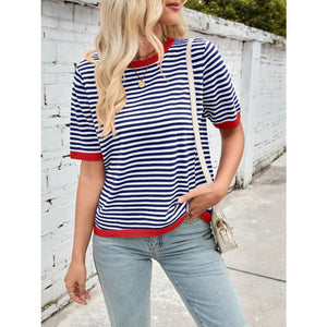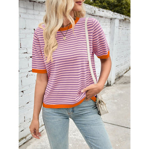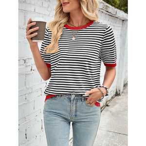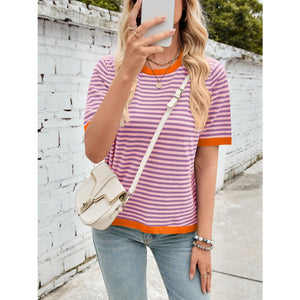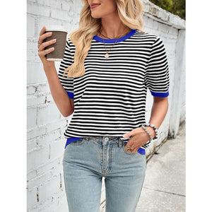 Lovelet Striped Contrast Round Neck Half Sleeve Knit Top