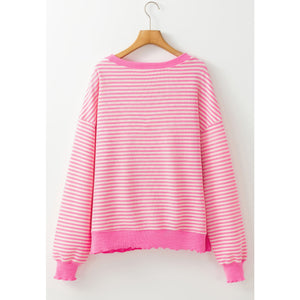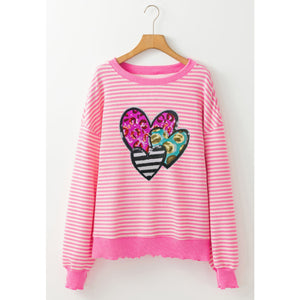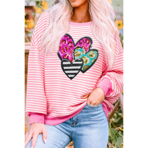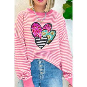 Striped Sequin Heart Round Neck Long Sleeve Sweatshirt