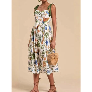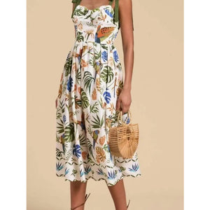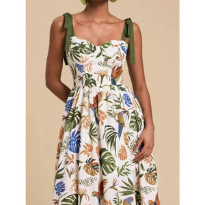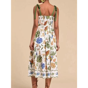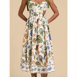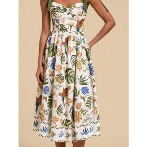 Tropical Print Tie-Shoulder Sweetheart Neck Midi Dress