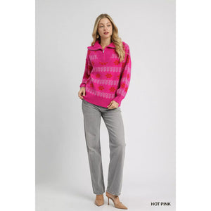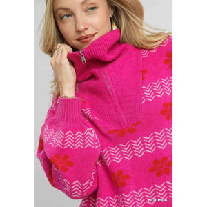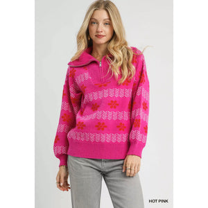 Umgee Floral Patterned Jacquard Quarter-Zip Pullover Sweater