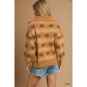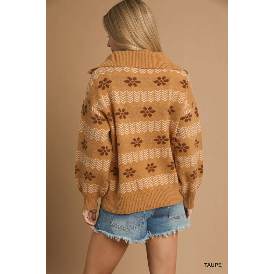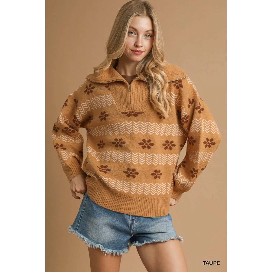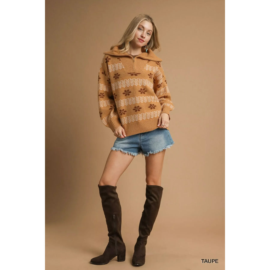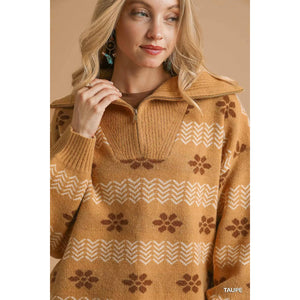 Umgee Floral Patterned Jacquard Quarter-Zip Pullover Sweater