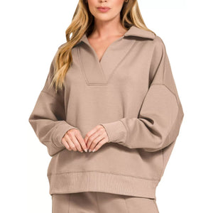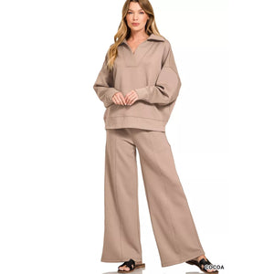 Step up your loungewear game with this sleek scuba collared pullover and pants set. The scuba material offers a modern and stylish look, while the collared design adds a touch of refinement. Perfect for relaxing at home or running errands in comfort and style. Elevate your casual wear with this coordinating set. A must-have addition to your leisure wardrobe.