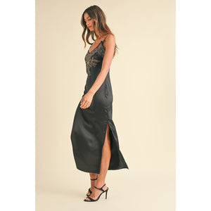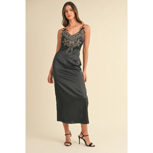 Embroidered Cami Satin Midi Slit Dress is a stunning and elegant option for any special occasion. The delicate embroidery adds a touch of sophistication to the luxurious satin fabric. The cami-style top paired with the midi length and slit detail creates a flattering and alluring silhouette. Perfect for a night out or a formal event, this dress exudes glamour and style. Dress it up with heels and statement jewelry for a red carpet-worthy look. Make a statement and turn heads in this beautifully crafted embroidered satin dress.