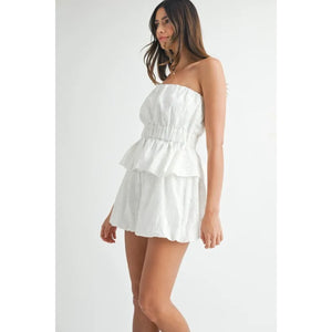 This set features a charming floral eyelet lace tube top and matching shorts. The delicate lace detail adds a touch of femininity and elegance to the ensemble. Perfect for warm weather days or special occasions, this set is both stylish and comfortable.