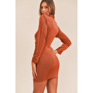 This long sleeve skinny mini shirt dress features a slinky bodycon silhouette with button-down closure for a chic and sleek look. The front ruched detail adds a flattering touch to the design. Shoulder pads provide structure and a fashion-forward element to the dress. Perfect for a night out or special occasion, this dress is versatile and stylish. Elevate your wardrobe with this trendy and form-fitting piece that is sure to turn heads.