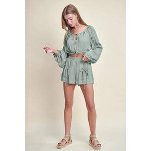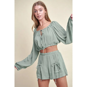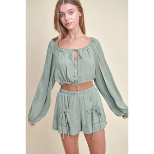 MABLE Gauze Long Sleeve Button Crop Top and Short Set