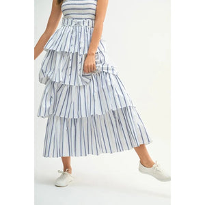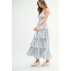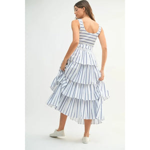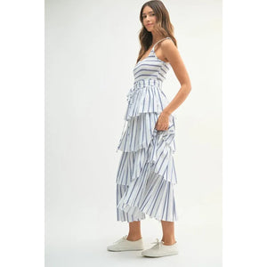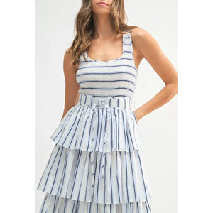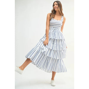 MABLE Pin Stripe Smocked Bodice Layered Midi Dress